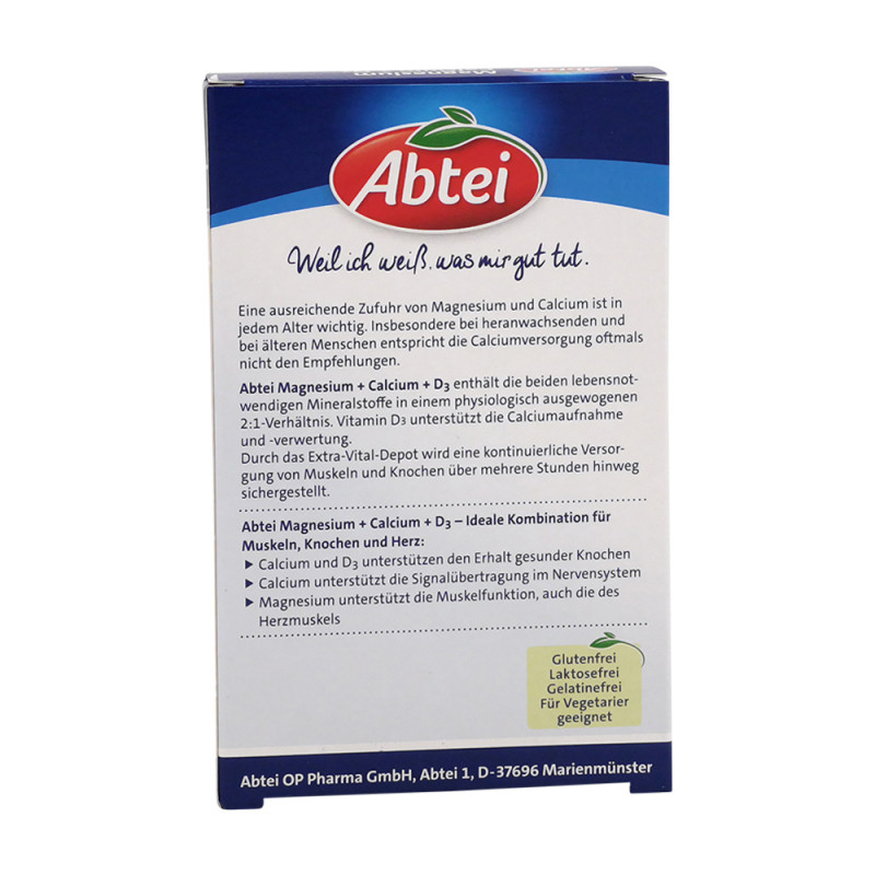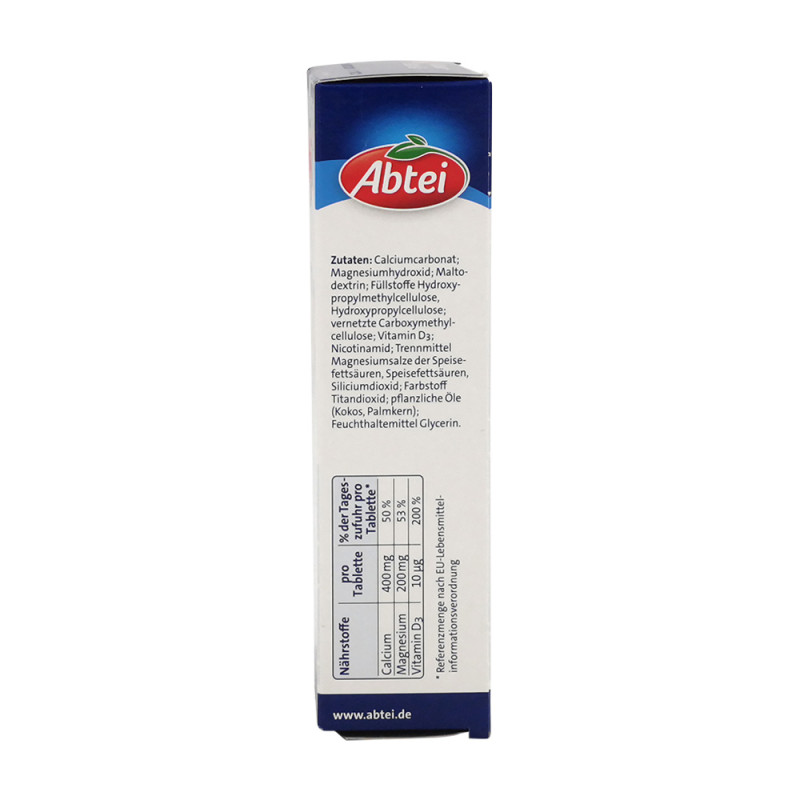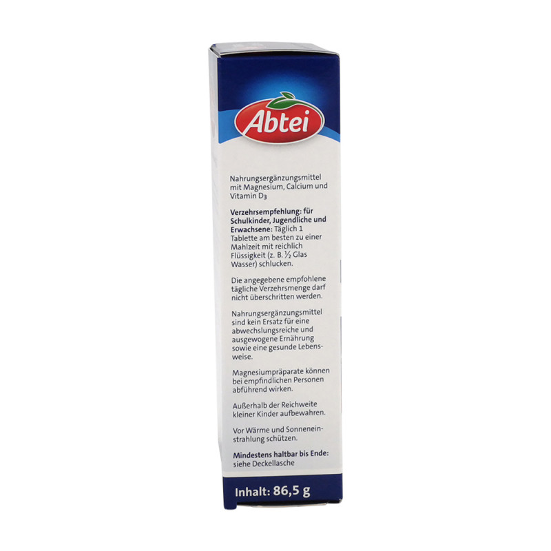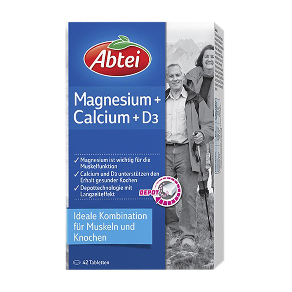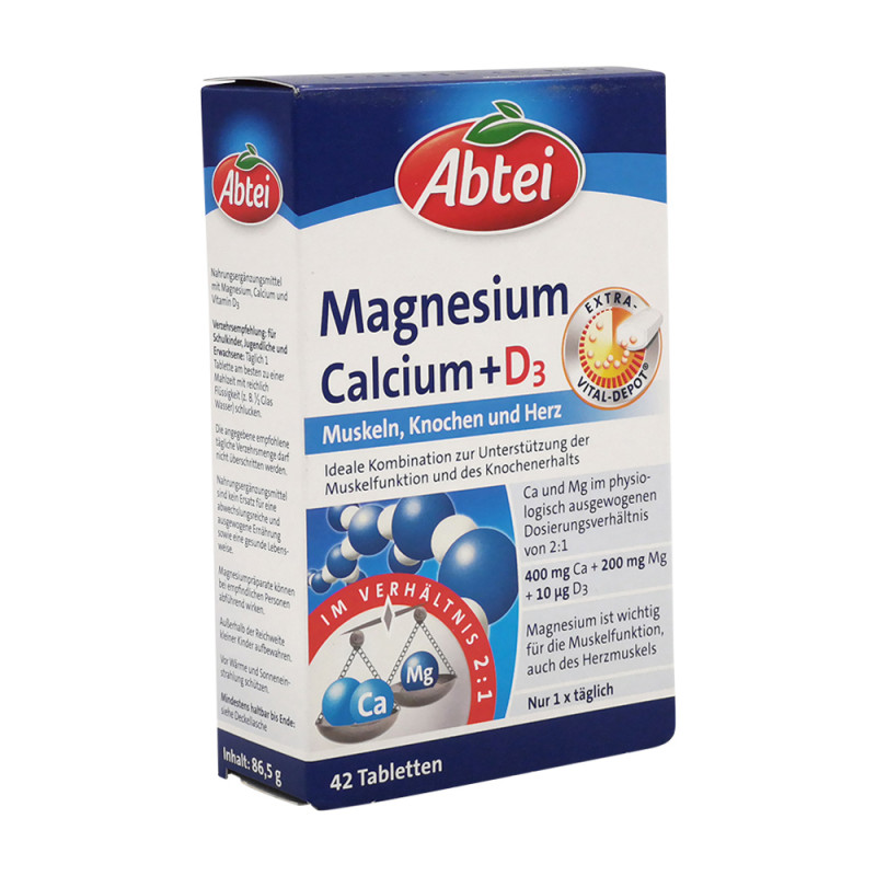 Abtei Magnesium Calcium + D3 Tabletten enthalten die beiden lebensnotwendigen Mineralstoffe in einem physiologisch ausgewogenen 2:1 Verhältnis. Vitamin D3 unterstützt die Calciumaufnahme und Verwertung, während sich Magnesium als wichtig für die Muskelfunktion erweist Sie bezahlen per Kauf auf Rechnung, PayPal, Kreditkarte oder Banküberweisung.