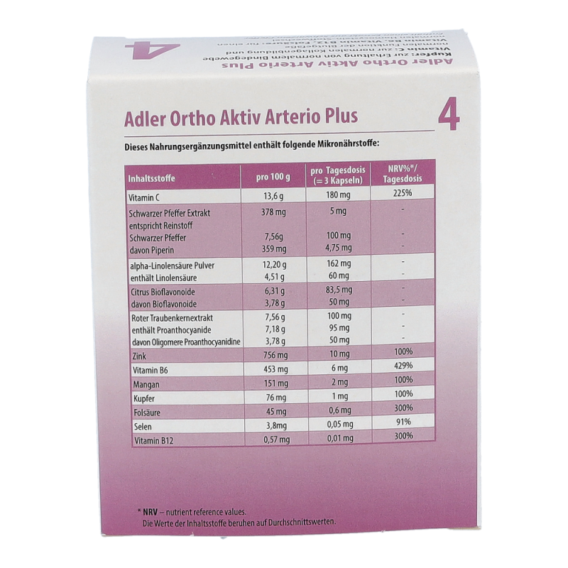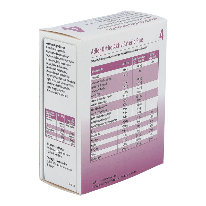 Adler Ortho Aktiv – die auf jedes Schüßler Salz von Nr. 1 – Nr. 12 abgestimmte Nährstoffkombinationen, welche die ganzkörperliche Wirkung des betreffenden Schüßler Salzes begleiten und unterstützen.Vitamin C trägt zu einer normalen Kollagenbildung für eine normale Funktion der Blutgefäße bei, trägt dazu bei, die Zellen vor oxidativem Stress zu schützenVitamin B6 trägt zu einem normalen Eiweiß- und Glycogenstoffwechsel und einem normalen Homocystein-Stoffwechsel beiVitamin B9 trägt zu einem normalen Homocystein-Stoffwechsel und zu einer normalen Funktion des Immunsystems beiVitamin B12 trägt zu einem normalen Homocystein-Stoffwechsel beiKupfer trägt zur Erhaltung von normalem Bindegewebe beiEnthält einen Extrakt aus Schwarzem Pfeffer.