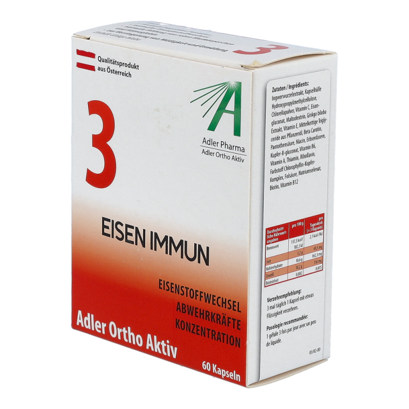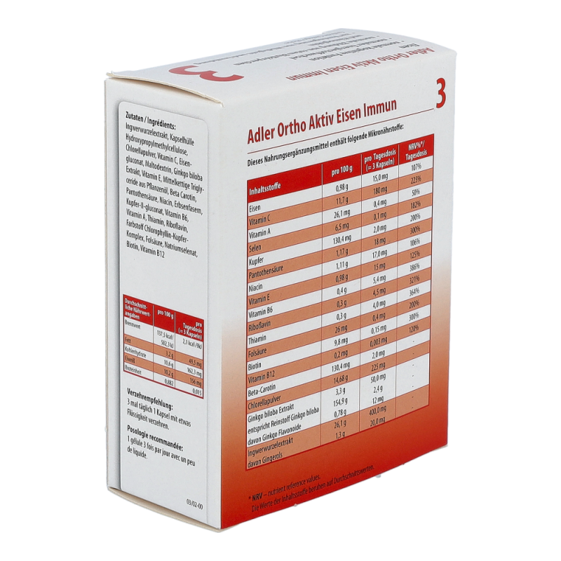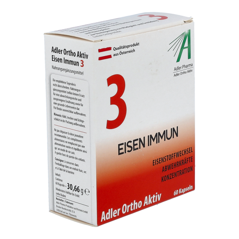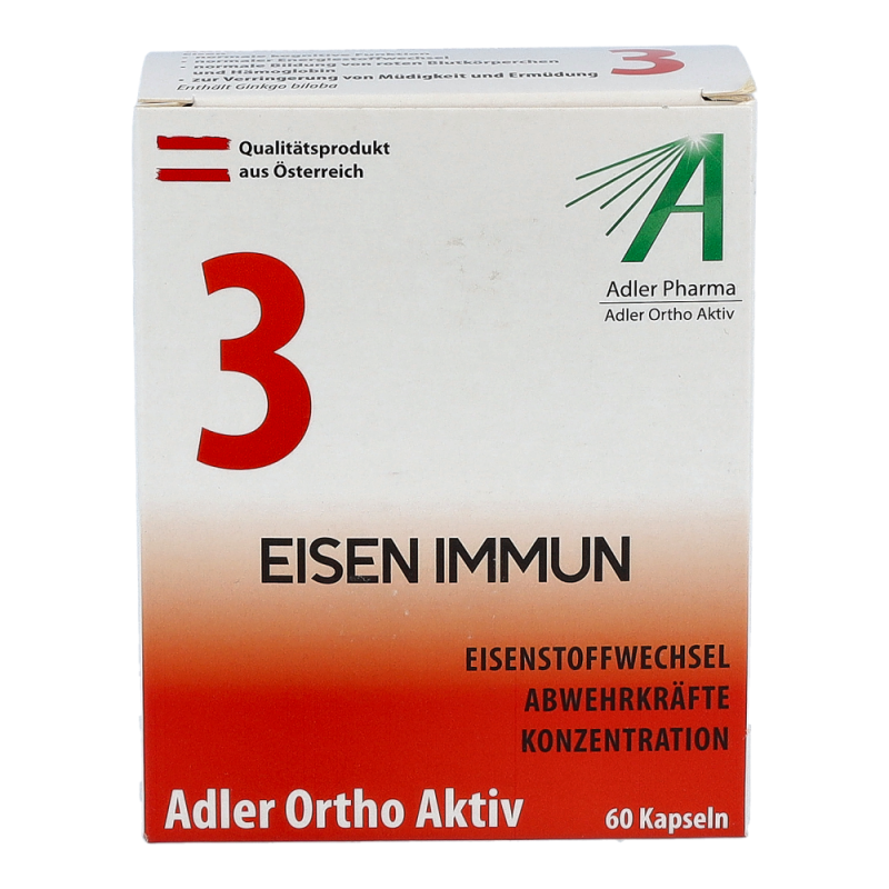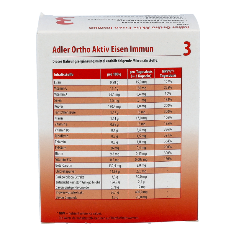 Adler Ortho Aktiv Nr. 3 Kapseln enthalten den Inhaltsstoff Eisen, welcher etwa zu einer normalen kognitiven Funktion, zu einem normalen Energiestoffwechsel und zur Verringerung von Müdigkeit und Ermüdung beiträgt. Außerdem enthalten diese Kapseln noch die Wirkstoffe Vitamin A, Vitamin C, Selen und Kupfer