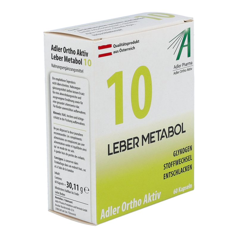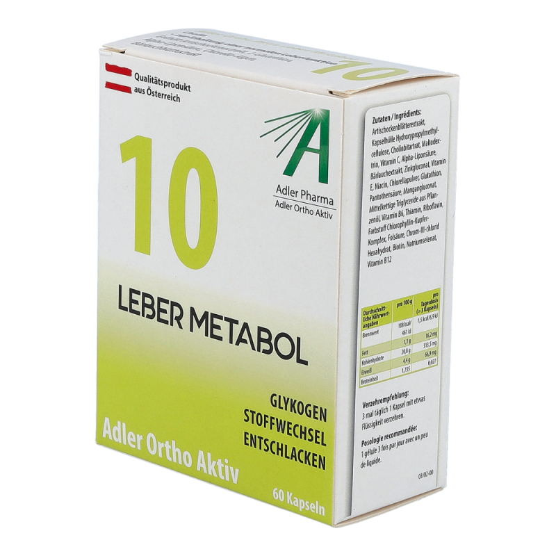 Die Adler Ortho Aktiv 10 Leber Metabol Kapseln begleiten und unterstützten die ganzkörperliche Wirkung des Schüßler Salzes Nr. 10. Sie wirken sich positiv auf den Fett- und Energiestoffwechsel aus und unterstützen die Leber in ihrer Schadstoffausscheidung. Die Kapseln können auch ohne Einnahme von Schüßler Salzen entsprechend der angegebenen Aussage auf der Packung angewendet werden.