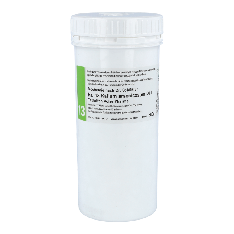 Adler Schüßler Salze Nr. 13 Kalium arsenicosum D12 Tabletten wirkt regulierend und stabilisierend auf Haut, Schleimhäute und Herz. Zum Einsatz kommt es vor allem bei chronischen Erkrankungen der Haut. Außerdem ermöglicht Kalium die Arbeit von Nerven und Muskeln. Ein Mangel daran kann etwa zu reduzierten Reflexen, geschwächter Muskulatur sowie Magen- und Darmfunktion, niedrigem Blutdruck und Ödemen führen.