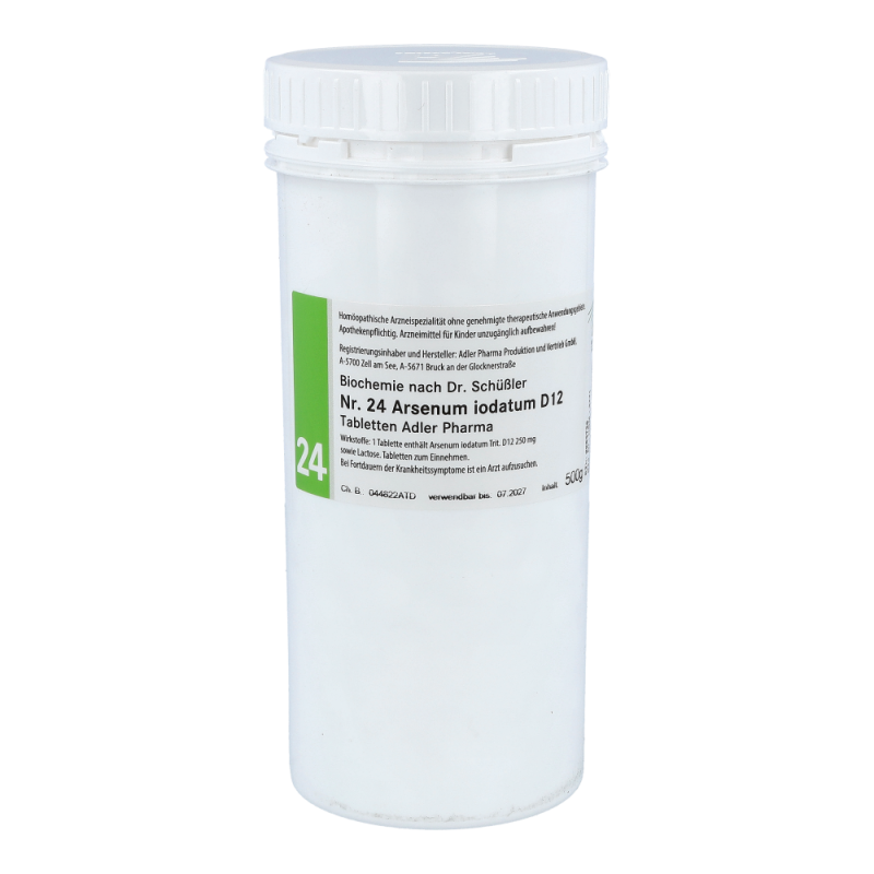 Schüßler Nr. 24 Arsen Jodatum wirkt zwar auf den ganzen Organismus, jedoch vor allem aber auf die Haut und Schleimhäute. Außerdem wird der Körper bei der Herstellung des Schilddrüsenhormons Thyroxin von Jod-Ionen unterstützt. Denn wenn der Körper zu wenig Thyroxin bildet, kann ein Kropf entstehen oder eine allgemeine Schwäche auftreten.