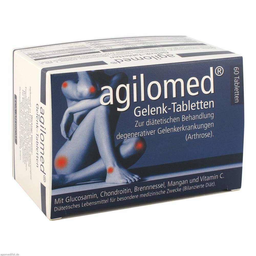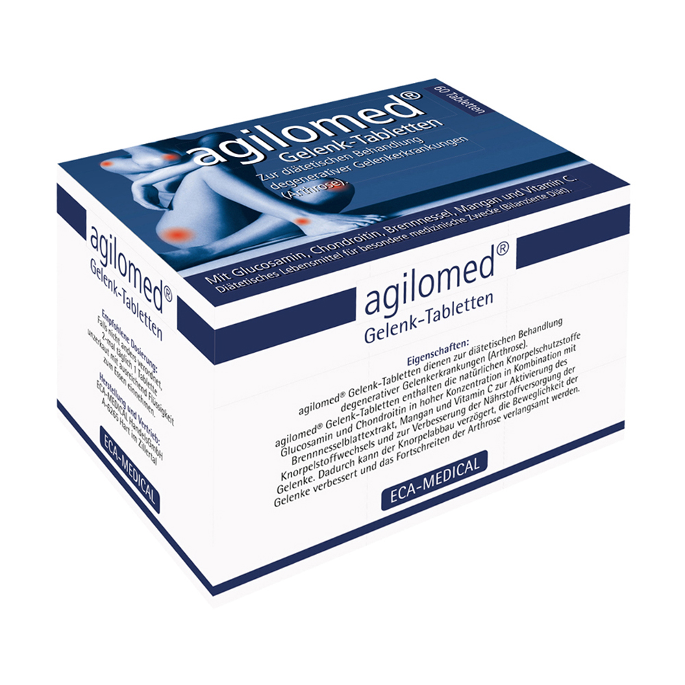 Agilomed Gelenk-Tabletten dienen zur diätetischen Behandlung degenerativer Gelenkerkrankungen. Diese Tabletten enthalten die biologischen Knorpelschutzstoffe Glucosamin- und Chondroitinsulfat, welche in Kombination mit Brennesselblätterextrakt zur Aktivierung des Knorpelstoffwechsels der Gelenke beitragen.