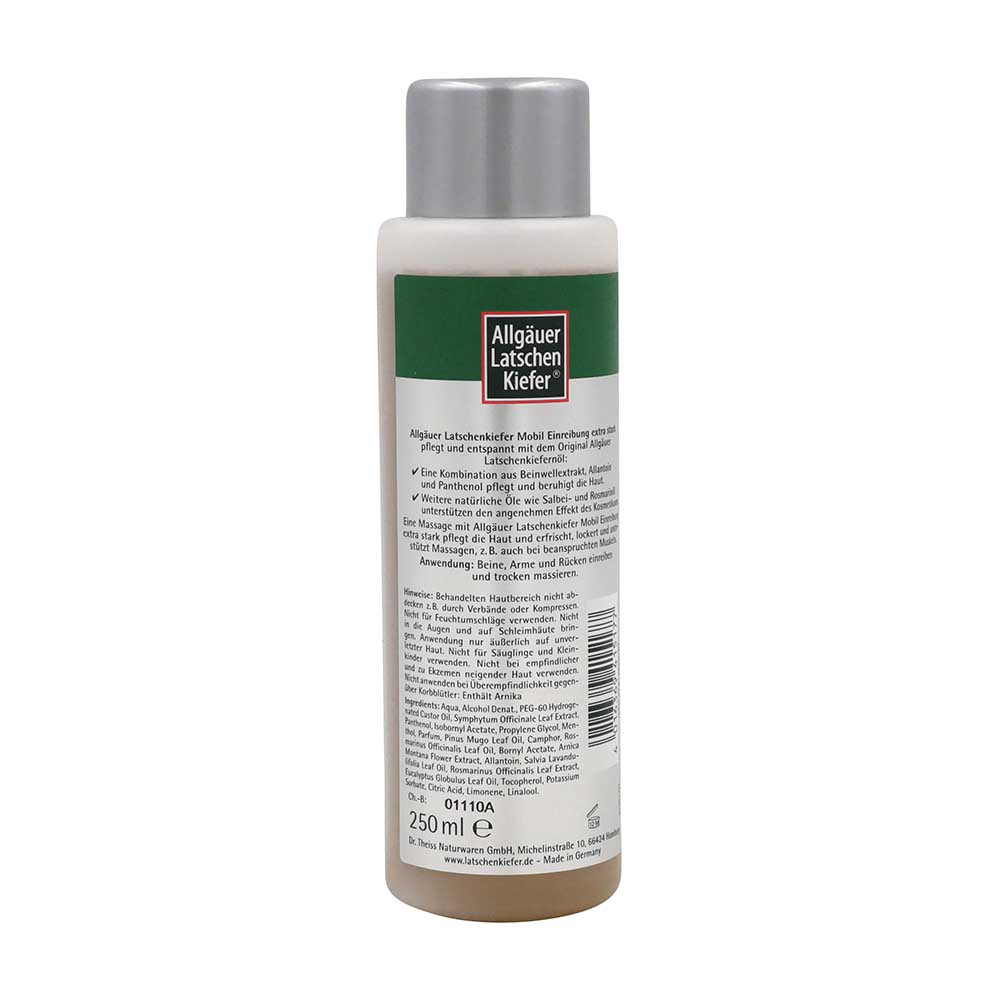 Allgäuer Latschenkiefer Einreibung Extra Stark pflegt und entspannt mit dem Original Allgäuer Latschenkiefernöl und dem Plus an weiteren, natürlichen Inhaltsstoffen. Eine Kombination aus Beinwellextrakt, Allantoin und Panthenol pflegt und beruhigt die Haut. Weitere natürliche Öle wie Salbei- und Rosmarinöl unterstützen den angenehmen Effekt des Kosmetikums.