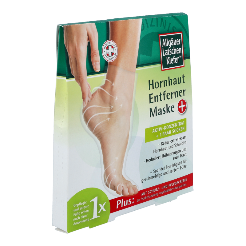 Allgäuer Latschenkiefer Hornhaut Entferner Maske schafft Abhilfe bei Schwielen und Hornhaut. Auch reduziert sie Hühneraugen, sowie raue Haut. Weiters spendet die Maske Feuchtigkeit und schenkt geschmeidige und zarte Füße.