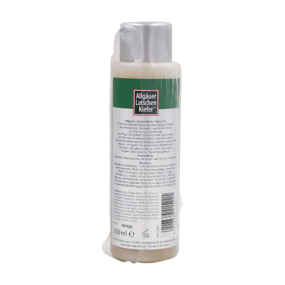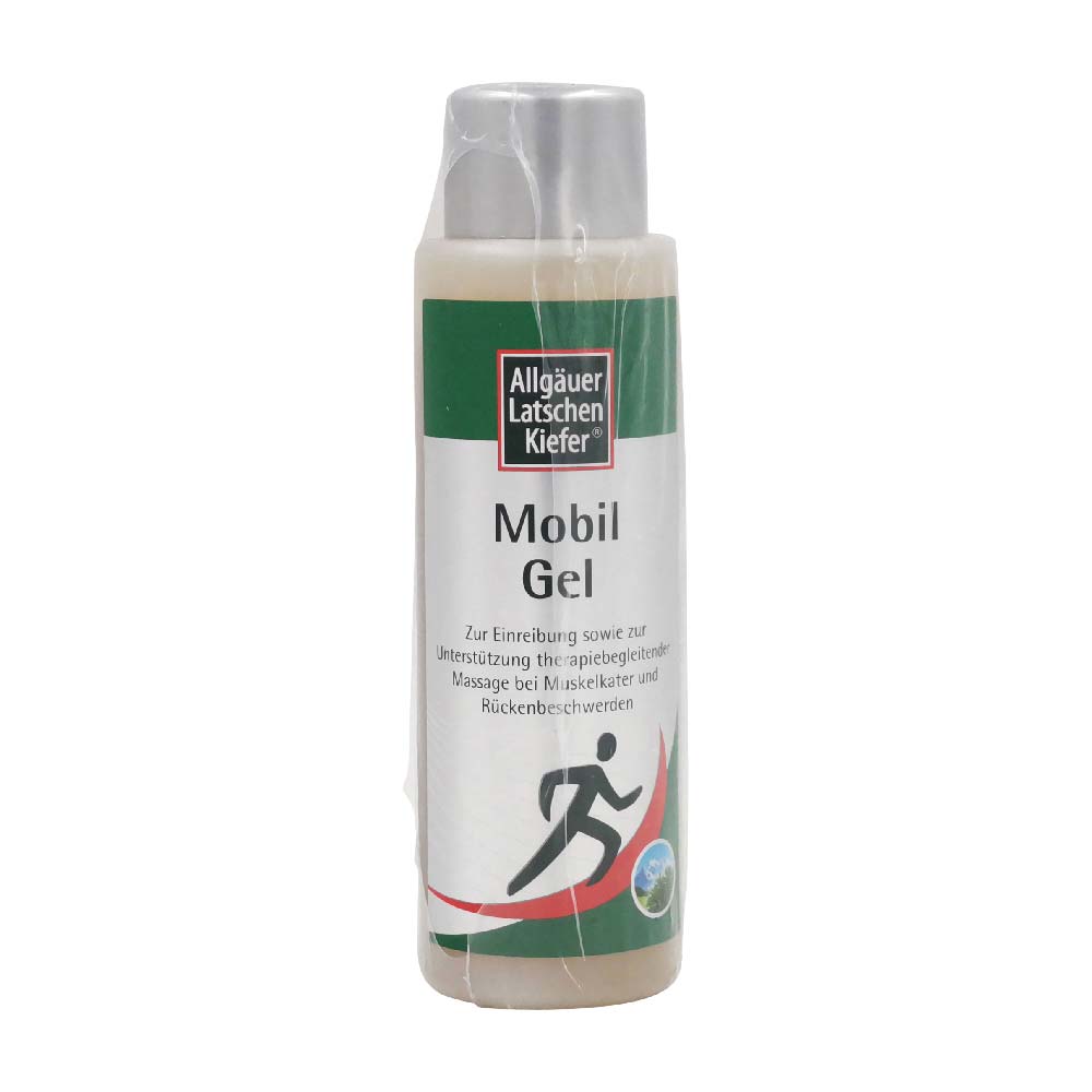 Allgäuer Latschenkiefer Mobil Gel st ein Spezialkosmetikum mit dem Original Allgäuer Latschenkiefernöl, wertvollem Beinwell- und Arnikaextrakt zur Einreibung und Massage. Das natürliche Pflege-Gel enthält zusätzlich eine Kombination aus Allantoin, Panthenol, Jojoba-, Salbei- und Rosmarinöl. Durch die Einreibung und Massage werden beanspruchte Muskeln entspannt.