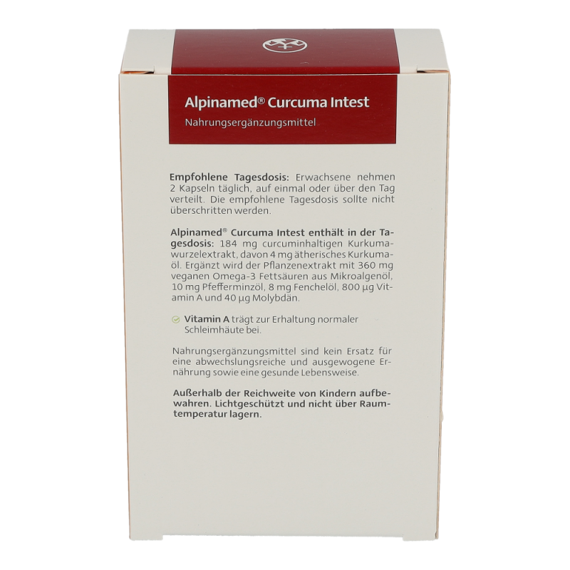 Alpinamed Curcuma Intest Kapseln enthalten Kurkumawurzelextrakt (184mg) mit darmverfügbaren Curcumin und turmeronhaltigem Kurukumaöl. Außerdem beinhalten sie Wohltuende ätherische Öle aus Fenchel und Pfefferminze und werden durch Vitamin A und Molybdän optimal ergänzt. Vitamin A pflegt den Verdauungstrakt und unterstützt die Schleimhaut.!