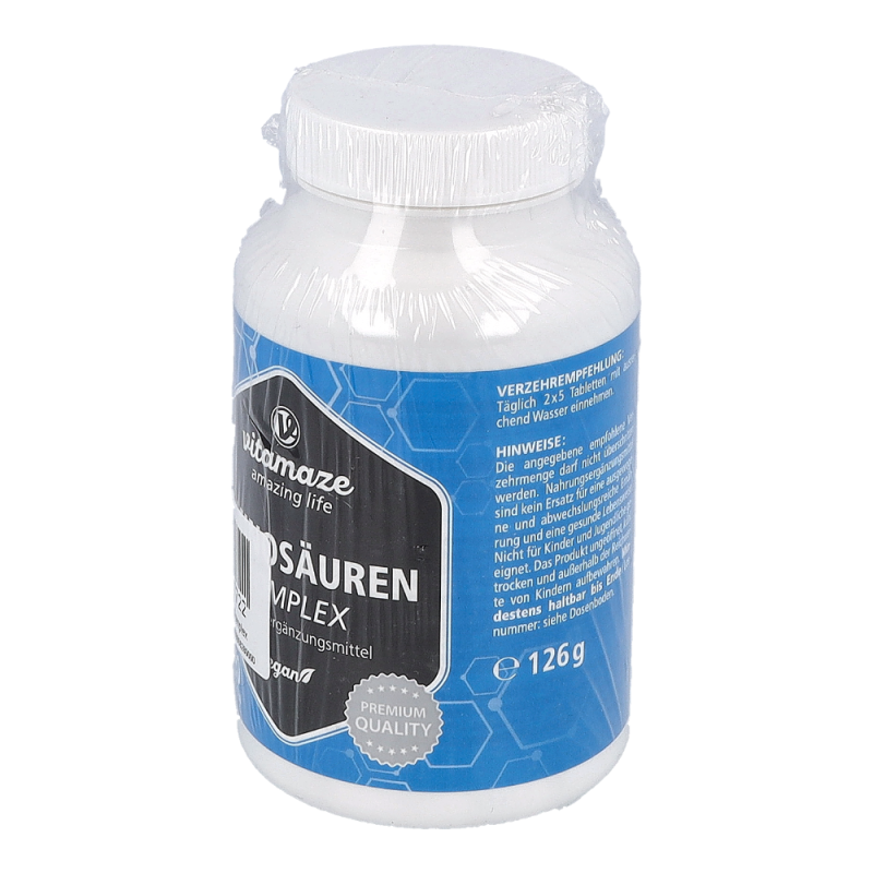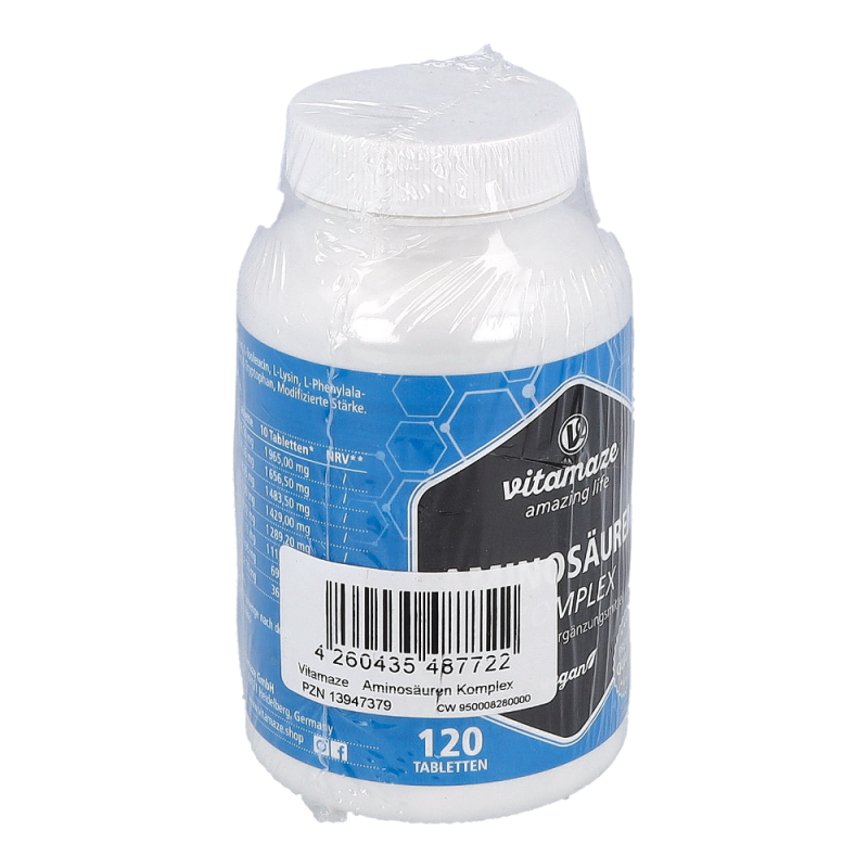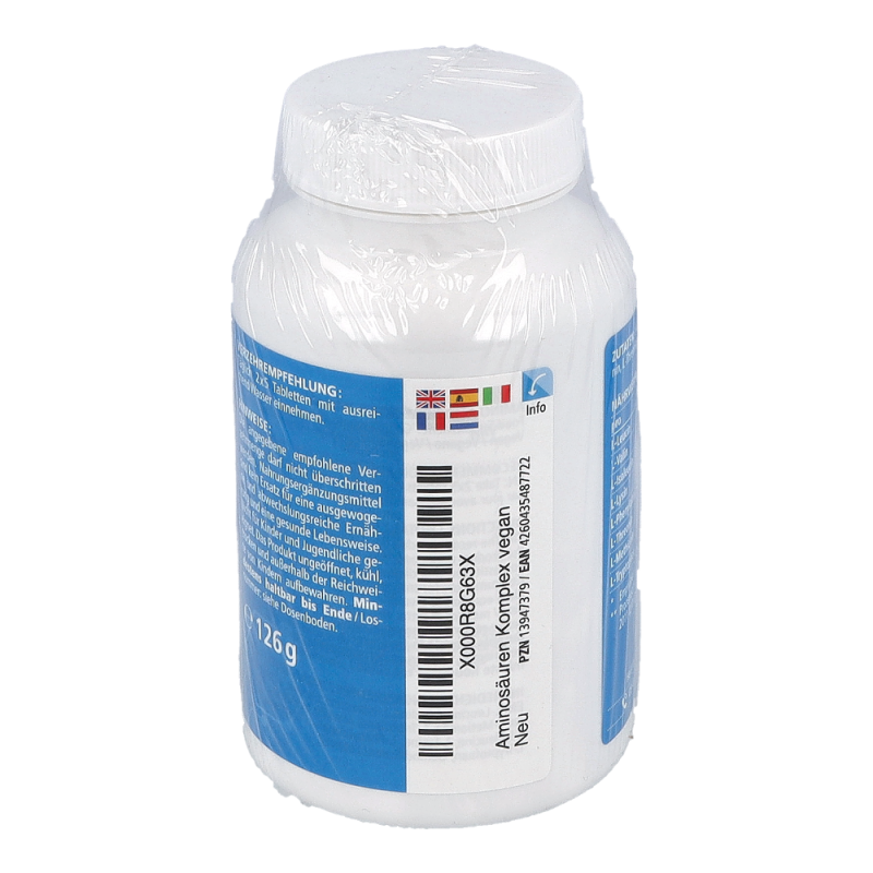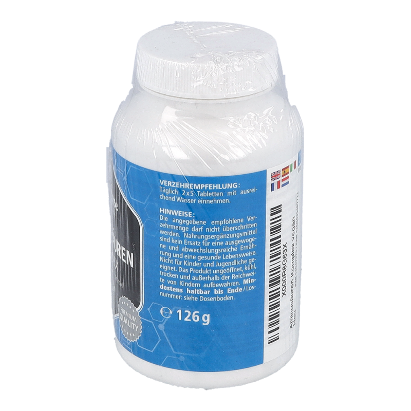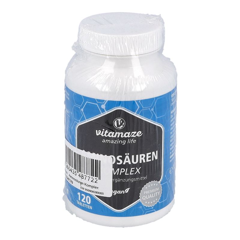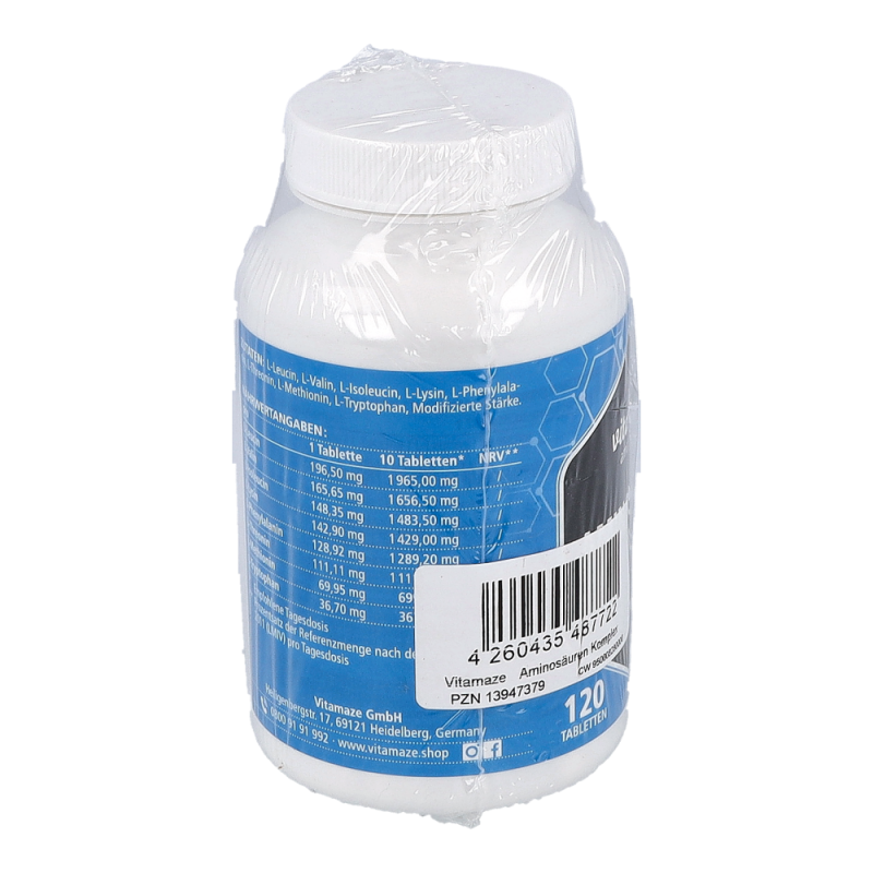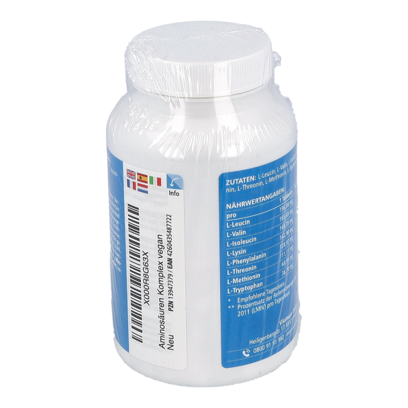 Aminosäuren Komplex Tabletten mit mehr als 10.000 mg reinen Aminosäuren pro Tagesdosis kombiniert zusätzlich 8 essentiellen Aminosäuren: L-Leucine, L-Lysin, L-Valin, L-Isoleucin, L-Phenylalanin, L-Threonin, L-Methionine und L-Tryptophan.
