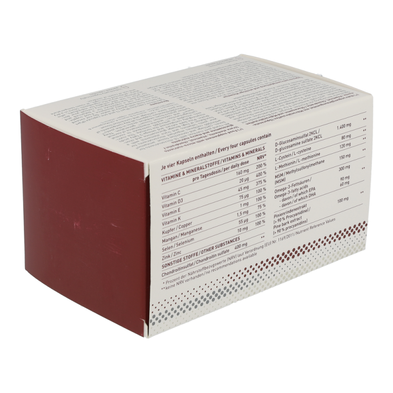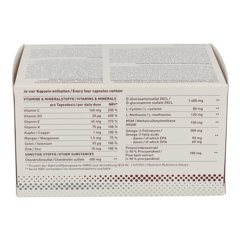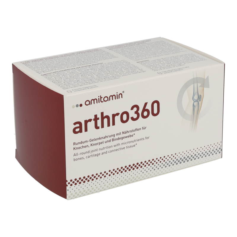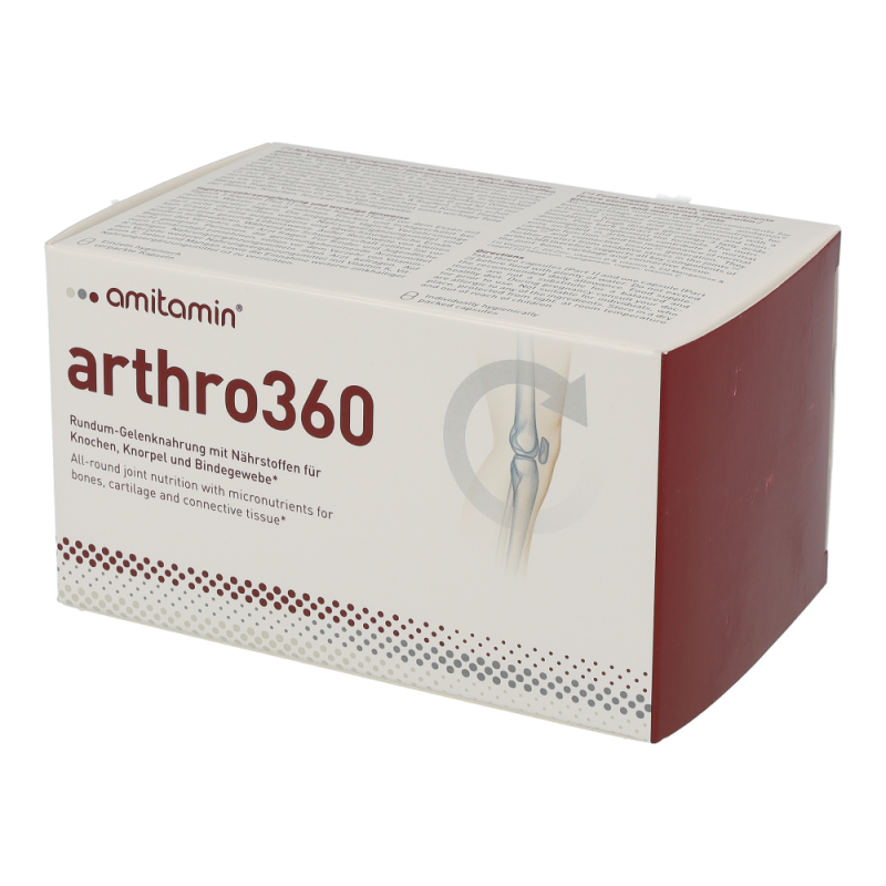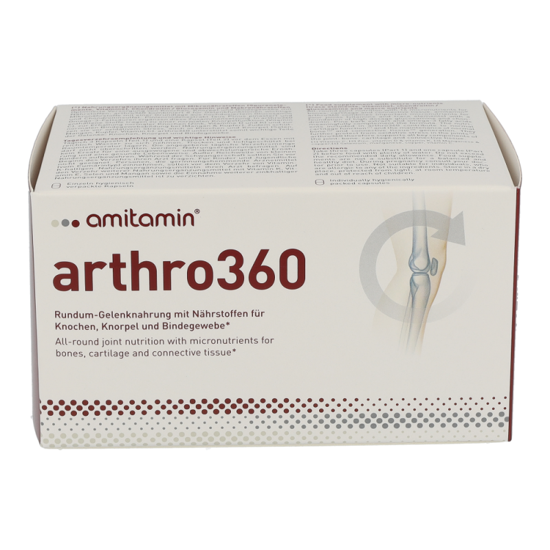 Amitamin Arthro 360 Kapseln verbinden insgesamt 15 Nährstoffe, die für Ihre Gelenke, also Knorpel, Knochen und Bindegewebe, wichtig sind. Die in diesen Kapseln enthaltenen Stoffe unterstützen die normale Knorpelfunktion und tragen zur Erhaltung normaler Knochen und zur normalen Bindegewebsbildung bei. Außerdem schützen die Wirkstoffe vor oxidativem Stress, auch in den Knochen.