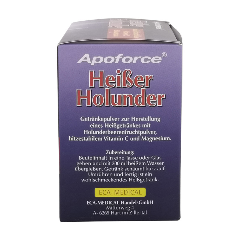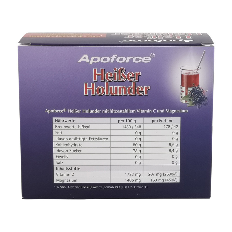 Apoforce Sachets Heißer Holunder sind die Basis für ein Heißgetränk mit dem fruchtigen Saftpulver von Holunderbeeren. Die Inhaltsstoffe Vitamin C und Magnesium wirken wohltuend auf den Körper.