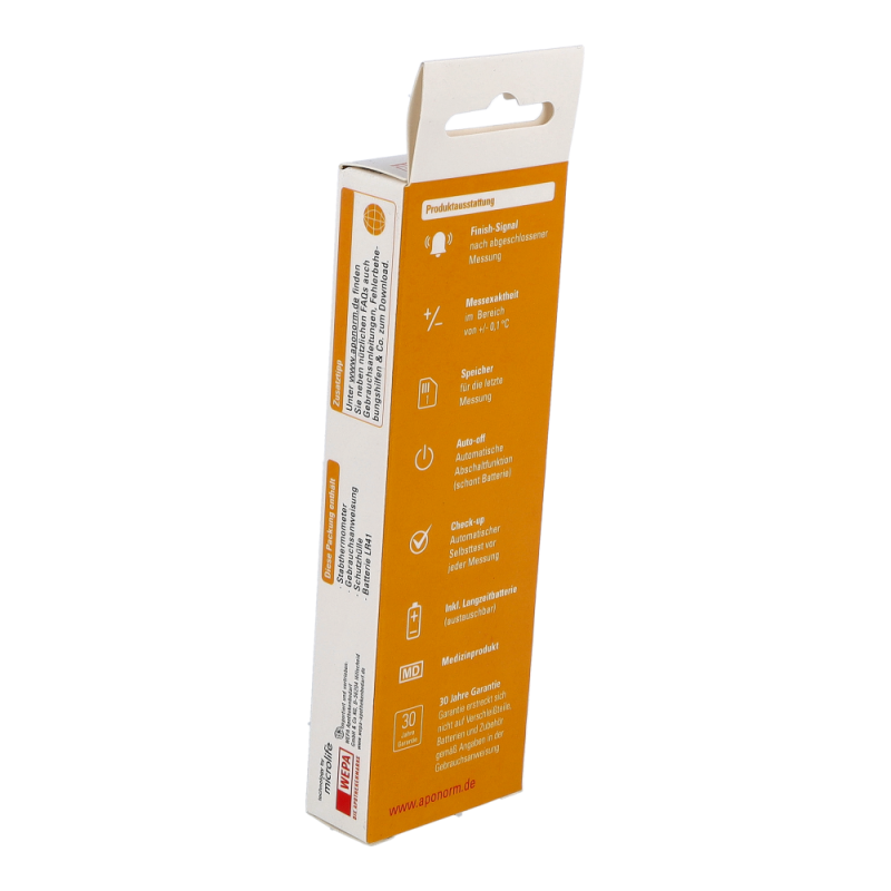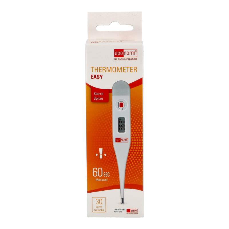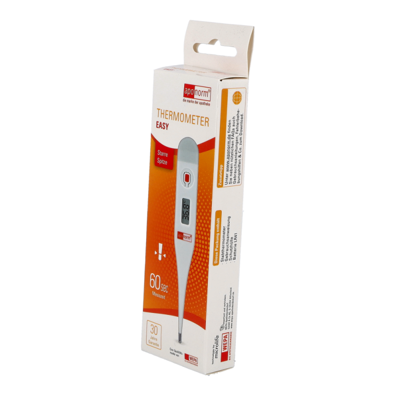 Das aponorm® Easy Stabthermometer liefert ein präzises Messergebnis in nur 60 Sekunden.Das Thermometer mit fester Spitze und automatischem Signalton speichert die letzte Messung und verfügt über eine Abschaltautomatik. Die austauschbare Langzeitbatterie ist ausreichend für ca. 3.000 Messungen.