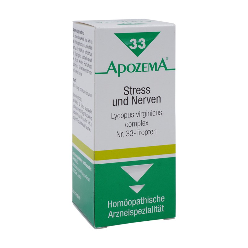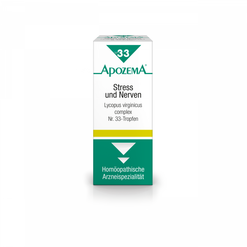 APOZEMA Stress- und Nerven-Tropfen Nr. 33 von APOMEDICA regen die Selbstheilungskräfte gemäß dem homöopathischen Arzneimittelbild bei Stress, nervösen Erschöpfungszuständen, Konzentrationsstörungen und innerer Unruhe an –.