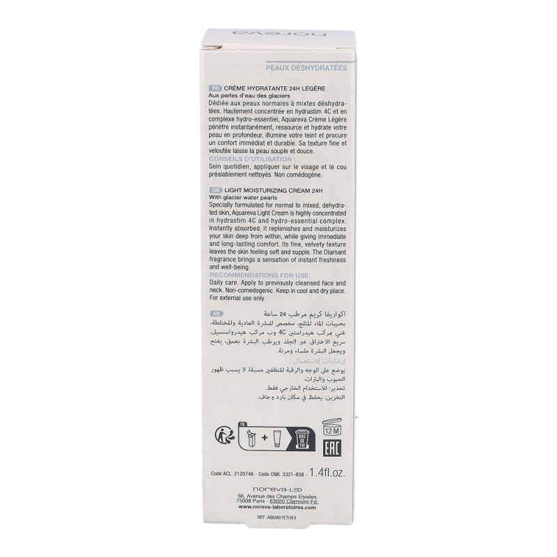 Aquareva Creme erhöht langanhaltend den Feuchtigkeitsgehalt der Haut. Die Creme schützt außerdem die Haut vor äußeren Umweltfaktoren und begrenzt den natürlichen Wasserverlust der Haut. Aquareva schenkt der Haut intensive Feuchtigkeit. Die Selbstregulierung der Haut wird angeregt.