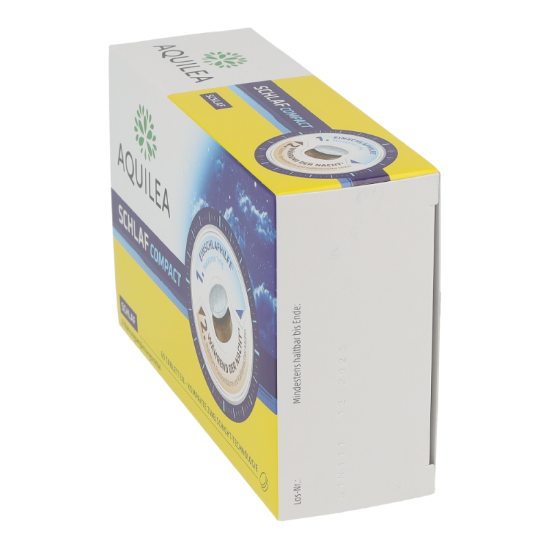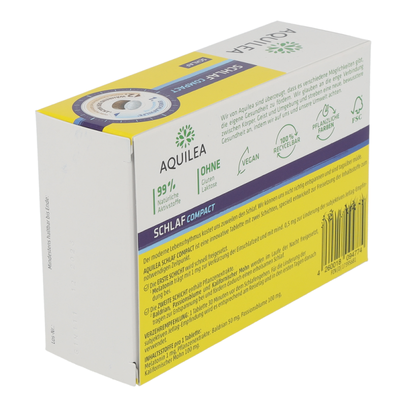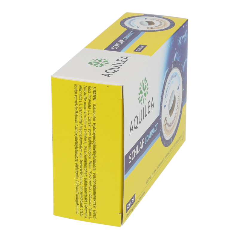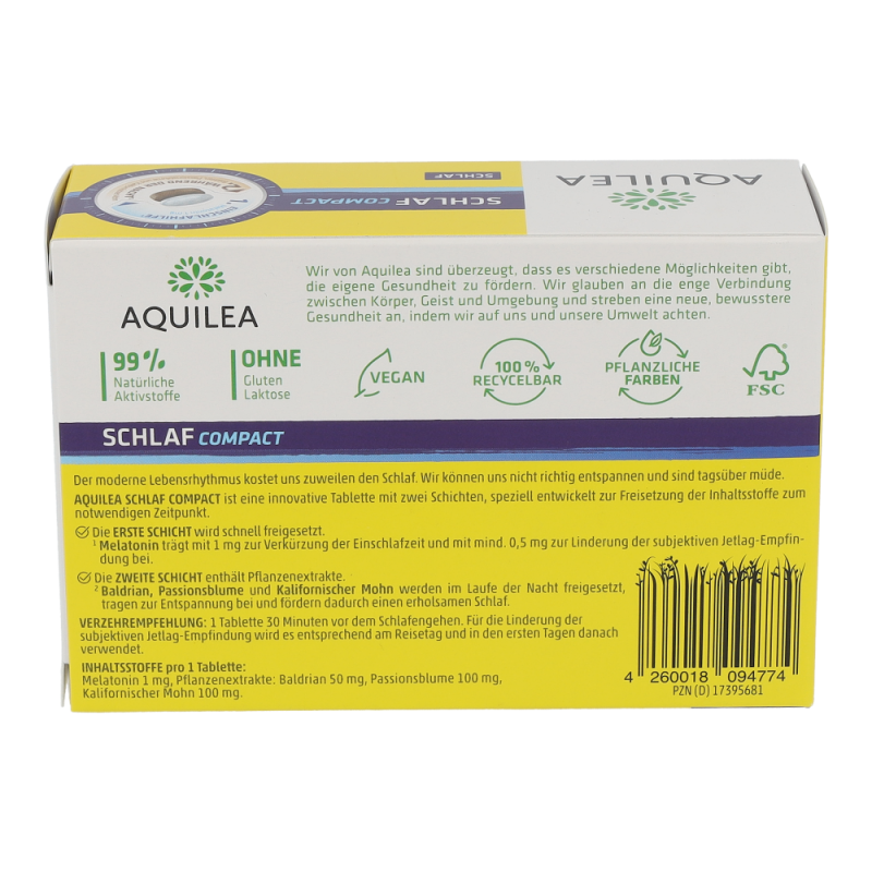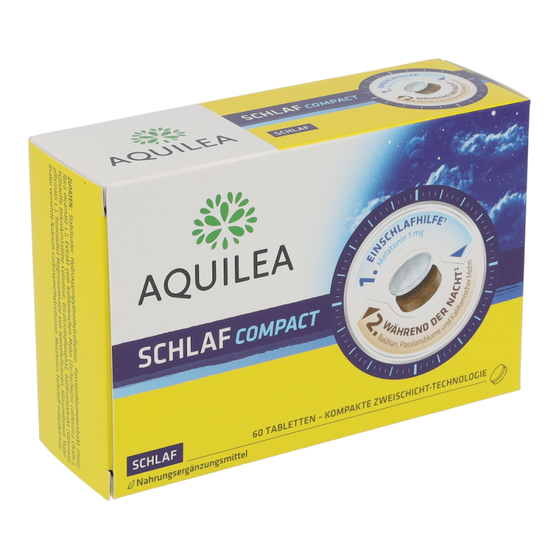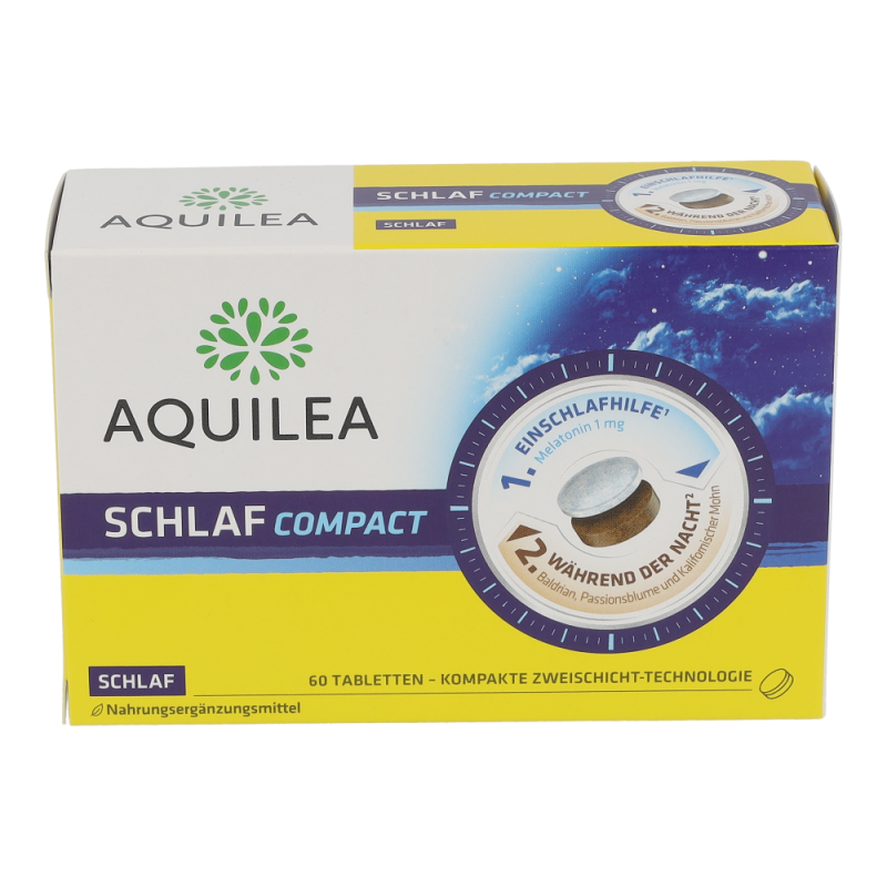 Die erste Schicht wird schnell vor dem Einschlafen freigesetzt und enthält Melatonin, eine Substanz, die unser Körper von Natur aus produziert und die beim Einschlafen hilft. Die zweite Schicht gibt ihre Wirkstoffe, darunter Baldrian, Passionsblume und Kalifornischen Mohn, nach und nach im Laufe der Nacht ab. Diese Pflanzenextrakte fördern die Entspannung und unterstützen einen erholsamen Schlaf während der gesamten Nacht. Aquilea Schlaf Compact – Ihre Unterstützung für eine bessere Schlafqualität.