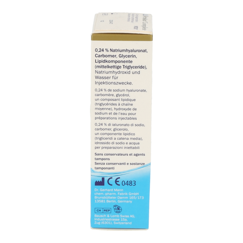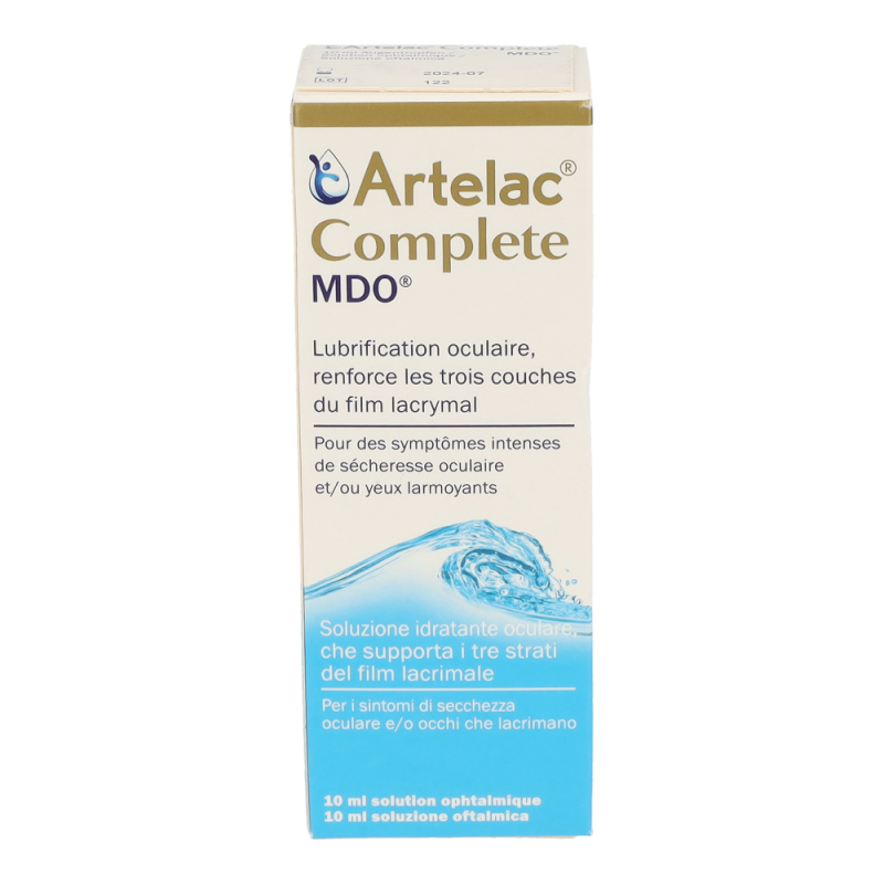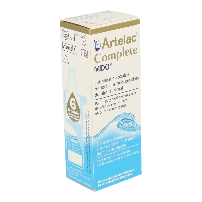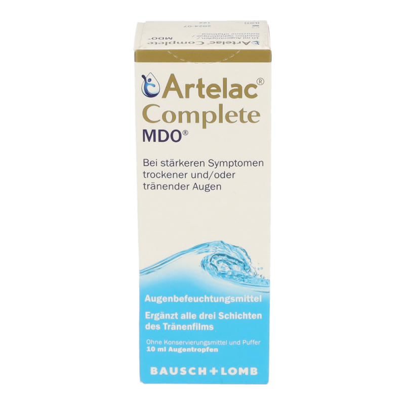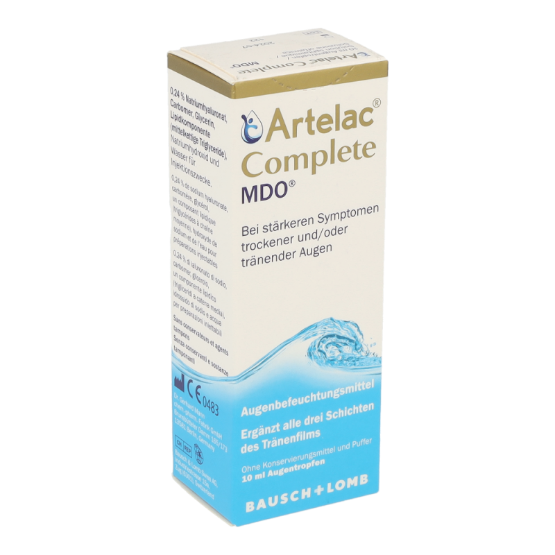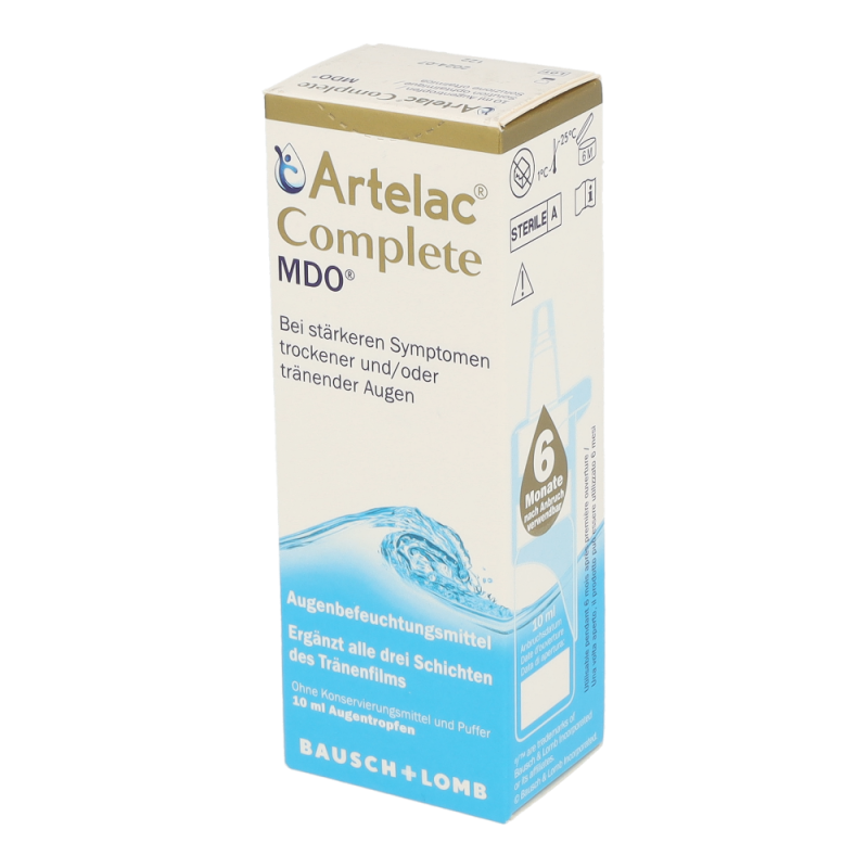 Die Artelac Complete MDO Augentropfen ist die Komplettlösung bei trockenen Augen. Es ist inspiriert von der Zusammensetzung der natürlichen Tränenflüssigkeit: Bereits ein Tropfen Artelac Complete MDO versorgt alle drei Schichten des Tränenfilms. Dabei stabilisieren die Augentropfen mit Lipiden die äußere Schicht, sodass die Verdunstung der Tränenflüssigkeit gemindert wird. Der natürliche Feuchtigkeitsspender Hyaluronsäure (0,24 %) und Glycerin binden Feuchtigkeit, das Carbomer befeuchtet und bindet zusätzlich Wasser im Tränenfilm.Durch den besonderen Pumpmechanismus ist Artelac Complete MDO puffer- und konservierungsmittelfrei und daher sehr gut verträglich.