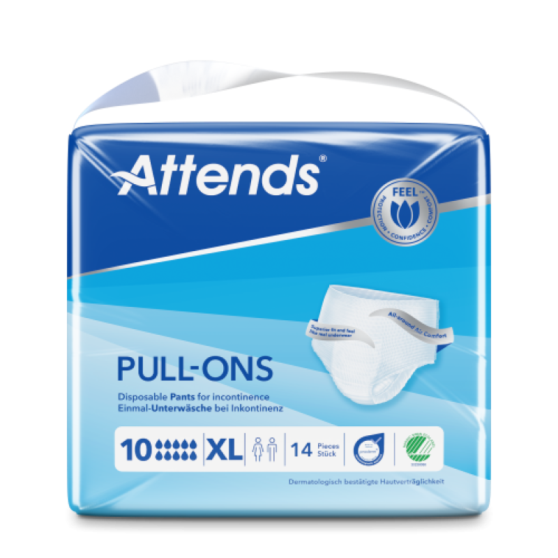 Attends Pull-Ons 10 sind weiche und diskrete Einmalhosen, die sich wie Unterwäsche anfühlen. Sie können ganz einfach an- und wieder ausgezogen werden und sind für starke Inkontinenz geeignet. Attends Pull-Ons bieten eine überlegene Passform für extra Tragekomfort. Ihr leistungsstarker Saugkern schützt vor Auslaufen und Geruch – für ein aktives Leben und ein sicheres Gefühl.