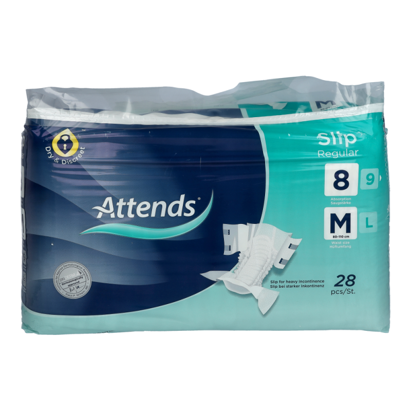 Attends Slip Regular 8 sind All-in-One Produkte bei starker Inkontinenz. Die vier wiederverschließbaren Klettverschlüsse ermöglichen einfaches Anlegen und die atmungsaktive Außenseite bietet zusätzliche Diskretion und Komfort. Der leistungsstarke Saugkern sorgt für verbesserten Auslaufschutz, optimale Hauttrockenheit und Geruchsbindung. Der Nässeindikator zeigt an, wann das Produkt gewechselt werden muss und unterstützt so bei der Pflege.
