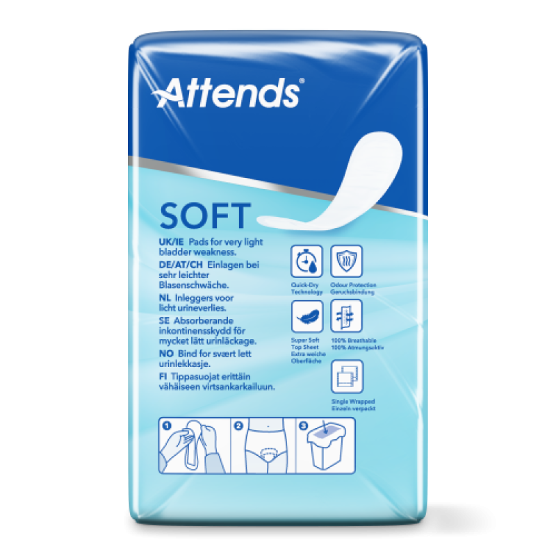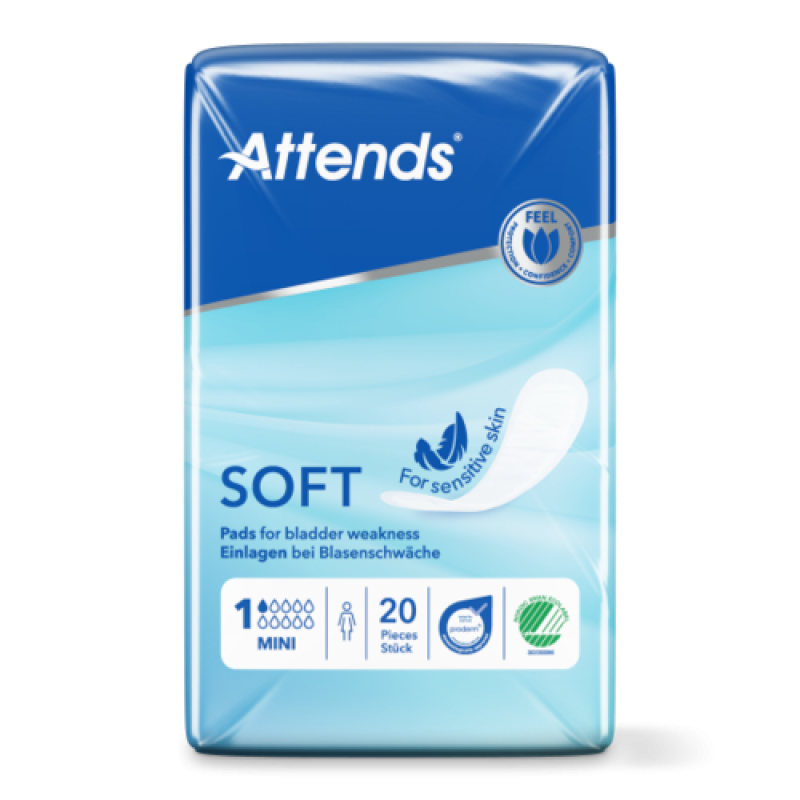 Attends Soft 1 Mini sind diskrete, körpergerechte Einlagen für die leichte Blasenschwäche. Sie hat eine seidenweiche Oberfläche für zusätzlichen Komfort und ist mit einem Klebestreifen versehen, der die Einlage sicher in Ihrer Unterwäsche hält, so dass Sie sich trocken und geschützt fühlen.