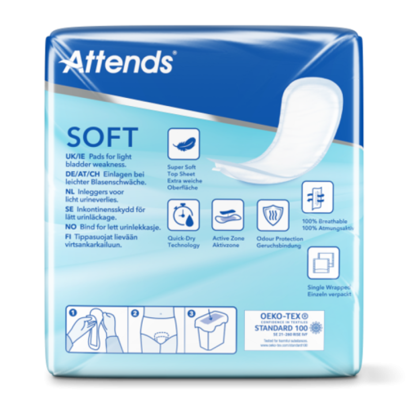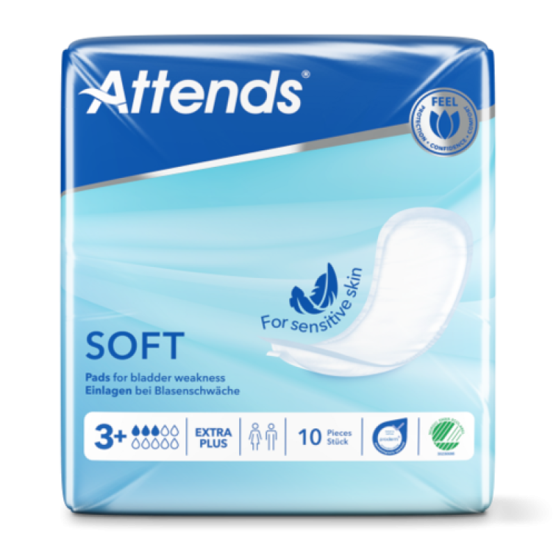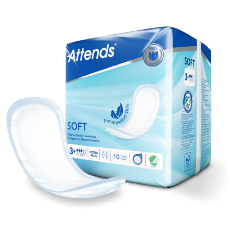 Attends Soft 3 Extra sind körpergerecht geformte Einlagen für die leichte bis mittlere Harninkontinenz. Die Einlage hat eine seidenweiche Oberfläche für zusätzlichen Komfort und ist mit einem Klebestreifen versehen, der sie sicher in Ihrer Unterwäsche hält, so dass Sie sich trocken und geschützt fühlen.