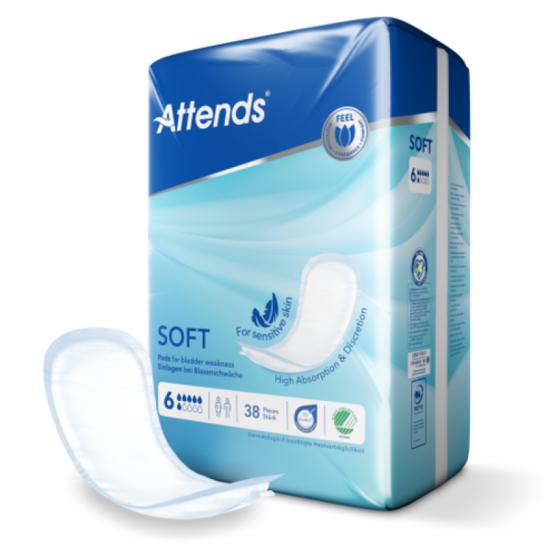 Attends Soft 6 sind anatomisch geformte Einlagen für die starke Harninkontinenz. Unsere Quick-Dry-Technologie und die Aktivzone bieten optimalen Auslaufschutz, damit Sie sich trocken und sicher fühlen.