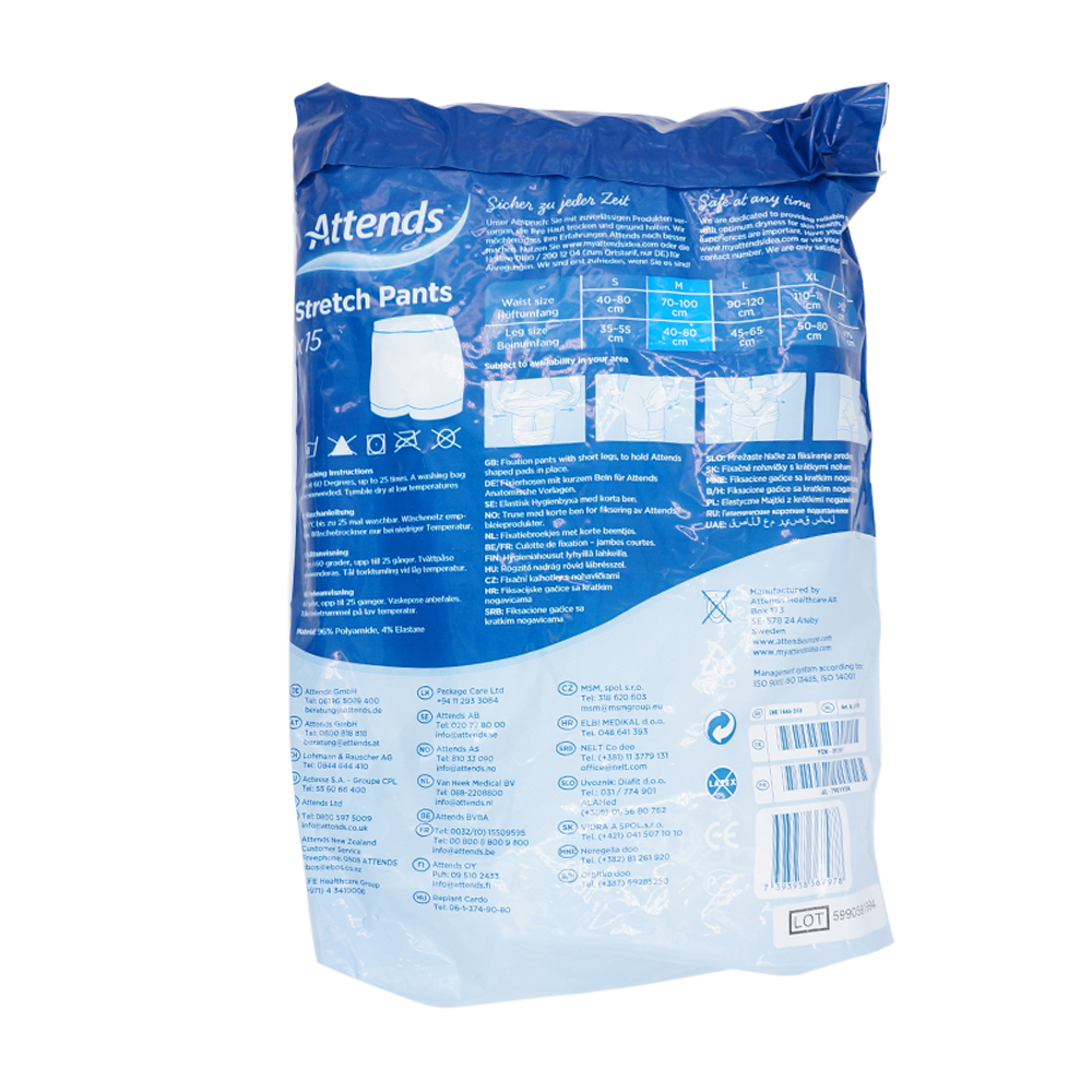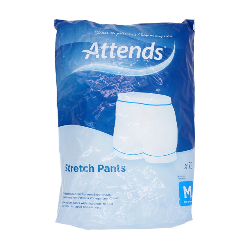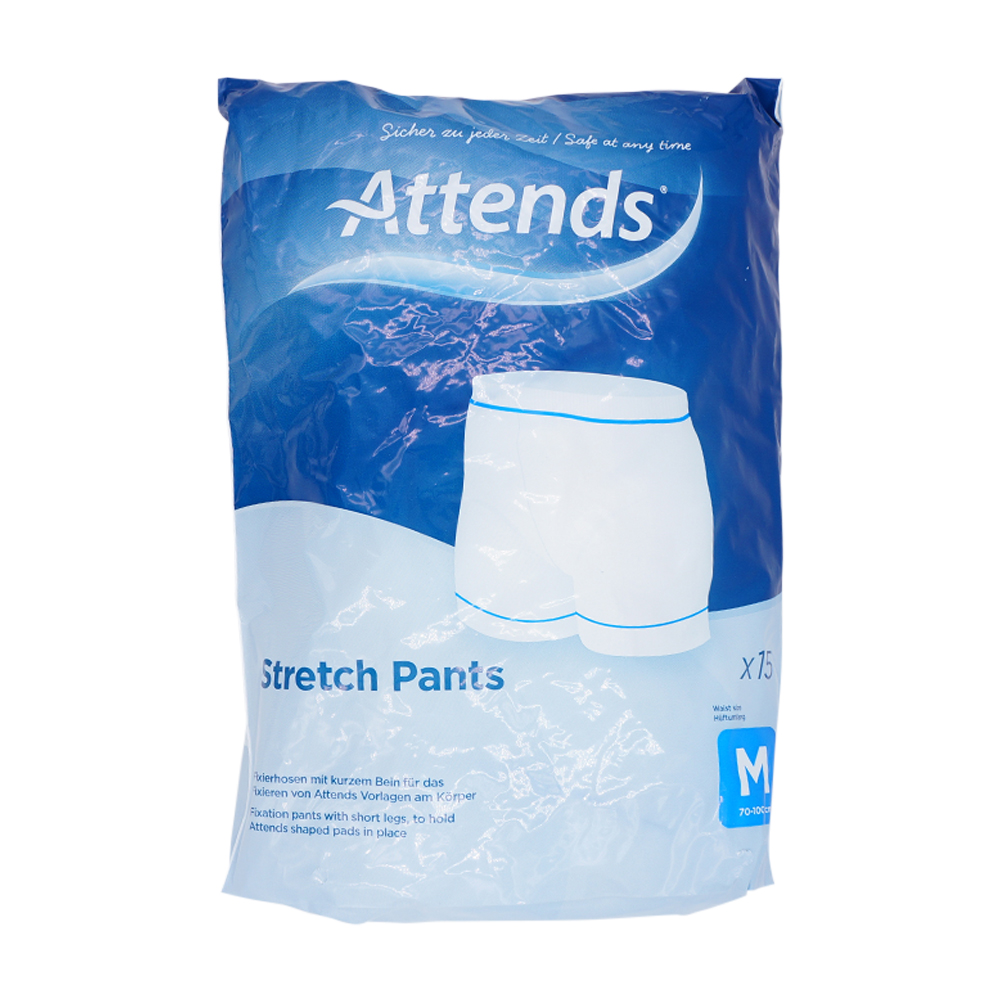 Attends Stretch Pants sind wiederverwendbare und waschbare Fixierhosen mit kurzem Bein. Sie bestehen aus weichem, elastischem und atmungsaktivem Material und halten anatomische Vorlagen von Attends sicher am Körper und sorgen für einen diskreten und sicheren Sitz und ein angenehmes Tragegefühl. Das nahtlose Design verhindert Abdrücke auf der Haut und sorgt für eine sichere und unauffällige Fixierung der Vorlage.