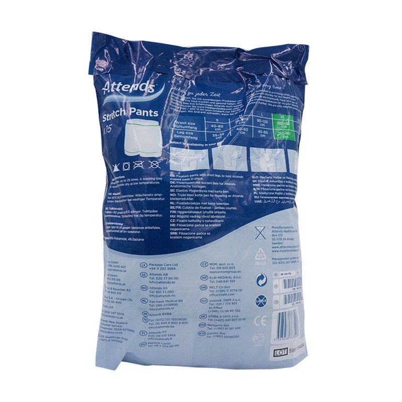 Attends Stretch Pants sind wiederverwendbare und waschbare Fixierhosen mit kurzem Bein. Sie bestehen aus weichem, elastischem und atmungsaktivem Material und halten anatomische Vorlagen von Attends sicher am Körper und sorgen für einen diskreten und sicheren Sitz und ein angenehmes Tragegefühl. Das nahtlose Design verhindert Abdrücke auf der Haut und sorgt für eine sichere und unauffällige Fixierung der Vorlage.