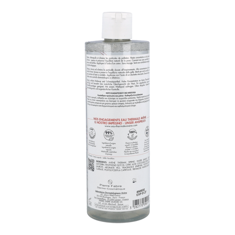 Dieses Mizellenwasser reinigt (sogar Schadstoffpartikel*), spendet Feuchtigkeit** und beruhigt empfindliche Gesichts- und Augenpartien in einem einfachen Schritt. Es enthält 99 % Inhaltsstoffe natürlichen Ursprungs und keine tierischen Bestandteile. Klärt und beruhigt die Haut, macht sie weich und sorgt für Wohlbefinden. Täglich entfernt dieses zart duftende Mizellenwasser Make-up und schenkt Geschmeidigkeit in einem einfachen und schnellen Schritt. Es verbessert die Feuchtigkeitsversorgung und bewahrt das natürliche Gleichgewicht der Haut dank der Kombination von Glycerin mit Trehalose und der hohen Konzentration an Avène Thermalwasser mit seinen beruhigenden Eigenschaften.