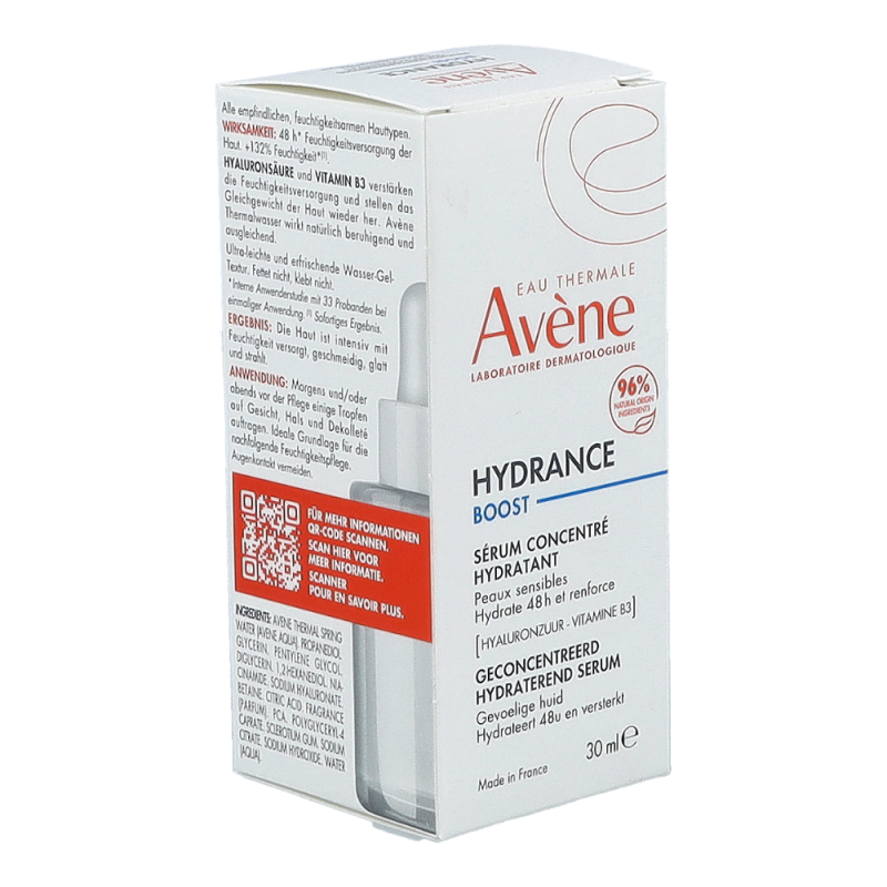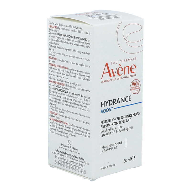 Dieses Serum ist ein echter Feuchtigkeitsbooster für das Gesicht. Es wirkt 48 Stunden* lang und bringt feuchtigkeitsarme, empfindliche Haut wieder ins Gleichgewicht. Seine Formulierung ist reich an Hyaluronsäure und Vitamin B3 (Niacinamide) und besteht zu 96 % aus natürlichen Inhaltsstoffen. Es hat eine frische, nicht fettende, nicht klebende, ultraleichte Gel-Wasser-Textur. Es zieht sofort ein und hinterlässt ein angenehmes Feuchtigkeitsgefühl auf der Haut. Hydrance BOOST Serum erhöht den Feuchtigkeitsgehalt der Haut und sorgt für eine glatte, belebte, gesund aussehende Haut. Sie gewinnt an Komfort, Weichheit und Geschmeidigkeit zurück.