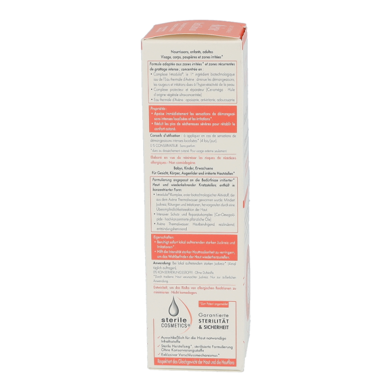 Dank I-modulia®, dem ersten biotechnologischen postbiotischen Aktivstoff aus dem Avène-Thermalwasser, der Juckreiz lindert, die Abwehrkräfte der Haut stimuliert und Irritationen bekämpft, in Kombination mit einem schützenden und reparierenden Komplex (Cer-omega und hochkonzentriertes Öl pflanzlichen Ursprungs) und dem beruhigenden, reizlindernden und entzündungshemmenden Avène Thermalwasser, lindert diese SOS-Hilfe für trockene Haut sofort intensiven lokalen Juckreiz* und Irritationen und reduziert gleichzeitig Ausbrüche starker Trockenheit.