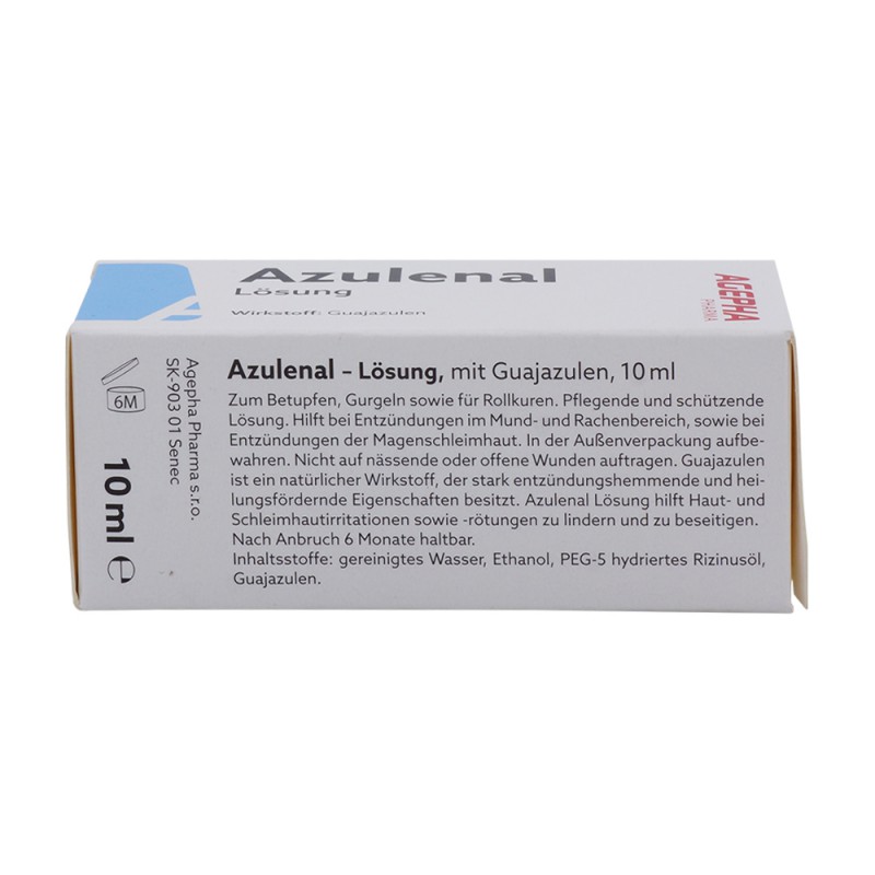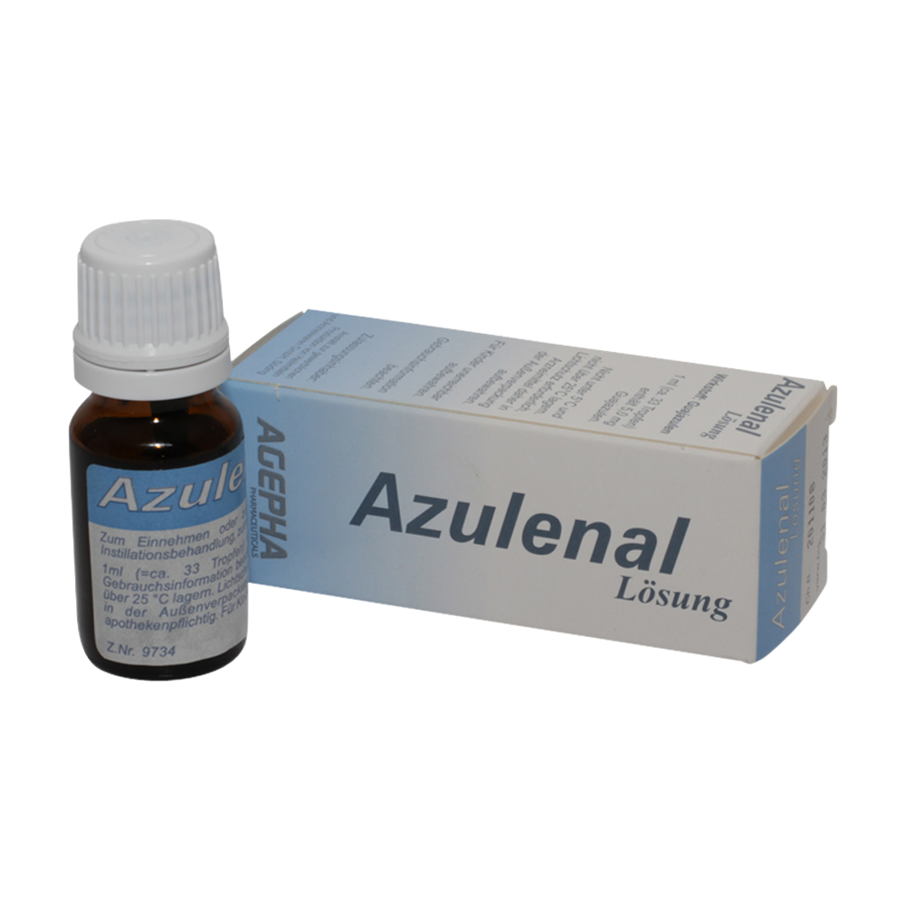 AZULENAL – Lösung hilft bei akuter und chronischer Schleimhautentzündung des Magens, bei Magen- und Zwölffingerdarmgeschwür. Zur besseren Magenverträglichkeit bei Medikation von p-Aminosalicylsäure (PAS)- und Sulfonamid-Präparaten, Harnblasenentzündung und Harnblasenneurose, Dickdarmentzündung, Entzündung der Schleimhäute des Mundes (Zahnfleischentzündung), der Nase und des Rachenraumes (Mandelentzündung), der Nebenhöhlen, des Ohres (Mittelohrentzündung). Entzündete und eiternde Wunden der äußeren Haut. Bei allergischen Entzündungen wie Heuschnupfen zur Schleimhautabschwellung, entzündlich-allergischen Hauterkrankungen, usw., Rollkur.