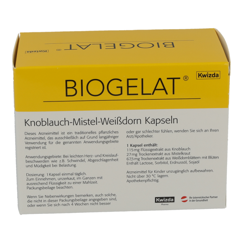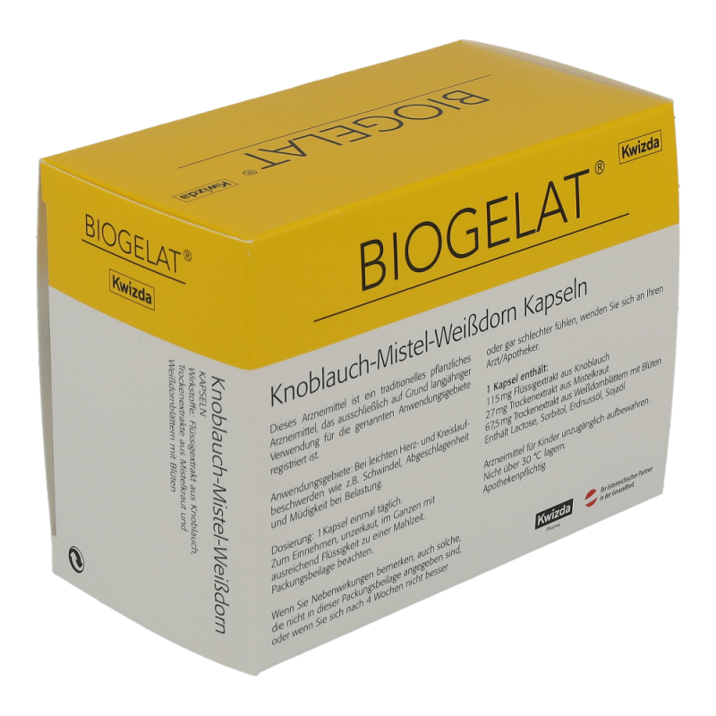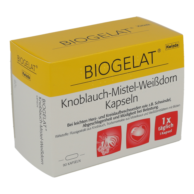 BIOGELAT Knoblauch-Mistel-Weißdorn Kapseln sind ein traditionelles pflanzliches Arzneimittel zur Anwendung bei leichten Herz- und Kreislaufbeschwerden wie z. B. Schwindel, Abgeschlagenheit und Müdigkeit bei Belastung.