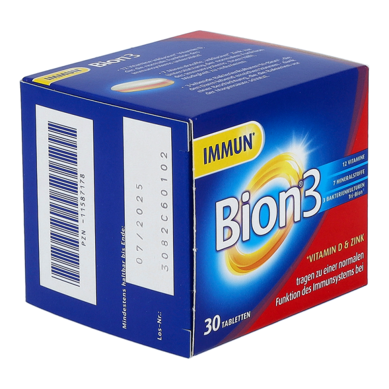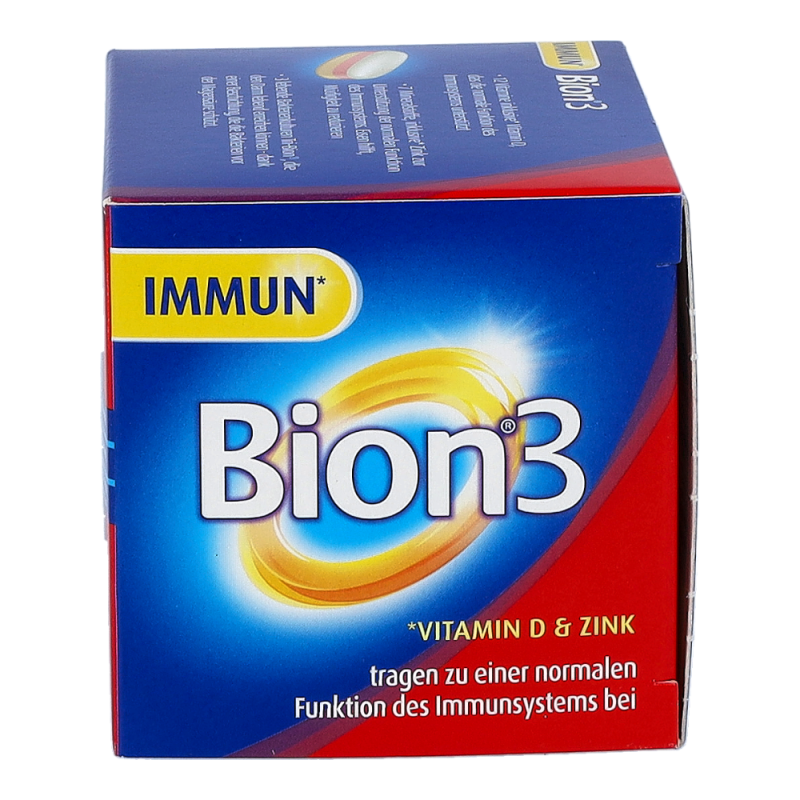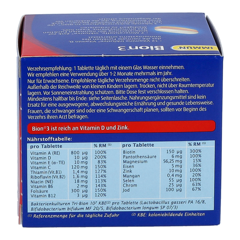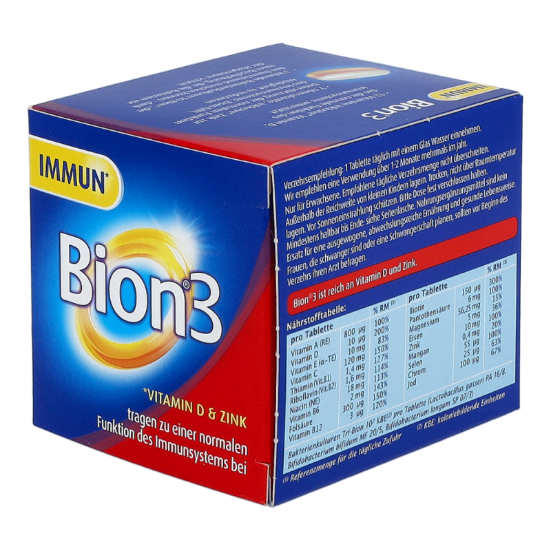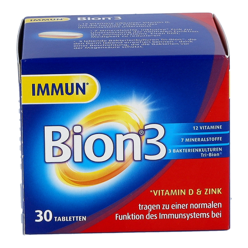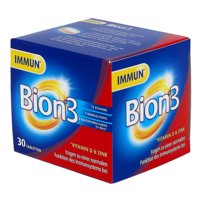 Bion 3 Immun unterstützt Ihr Immunsystem – die spezielle 3in1 Tablette bietet eine einzigartige Kombination aus lebenden Bakterienkulturen, Mineralstoffen und Vitaminen. Bion3 Immun enthält 3 lebende Bakterienkulturen: Lactobacillus gasseri, Bifidobacterium bifidum und Bifidobacterium longum. Die Tri-Bion Technologie schützt die Bakterien mit einer speziellen Beschichtung vor der Magensäure und sorgt so dafür, dass diese den Darm lebend erreichen können. Außerdem enthält Bion3 Immun 7 ausgewählte Mineralstoffe und 12 Vitamine. Gib deinem Immunsystem die Unterstützung, die es braucht mit Vitamin A, C, D, B6, B12 und Folsäure und Eisen, Zink und Selen.