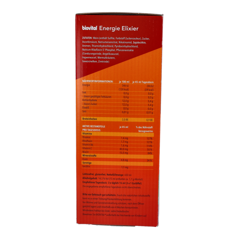 BIOVITAL® Energie-Elixier von BAYER hilft die natürliche Leistungskraft und die Nerven zu stärken, Körper und Geist morgens zu aktivieren, abends zu beruhigen und für einen guten Schlaf zu sorgen.Zur Erhaltung der Vitalität und der natürlichen Leistungskraft ist es wichtig, den Körper mit zusätzlichen Vitalstoffen zu versorgen. Das Energie Elixier von biovital unterstützt die Verbesserung der Leistungsfähigkeit und des allgemeinen Wohlbefindens. Das Nahrungsergänzungsmittel ist mit wertvollen Vitalstoffen wie Vitamin B6 und C, Eisen, Niacin, Thiamin und Riboflavin angereichert..