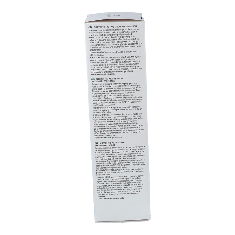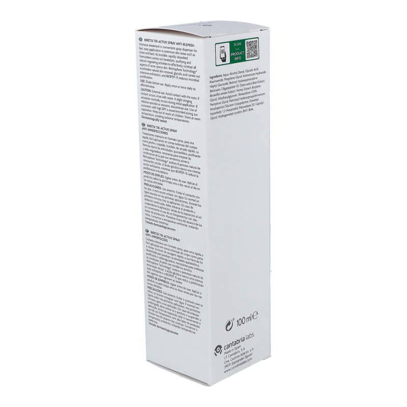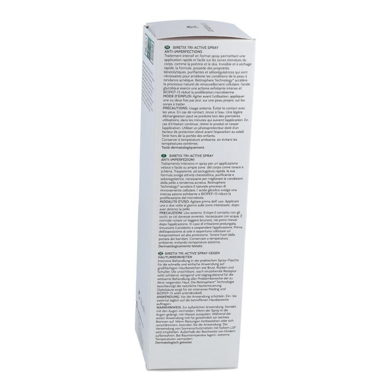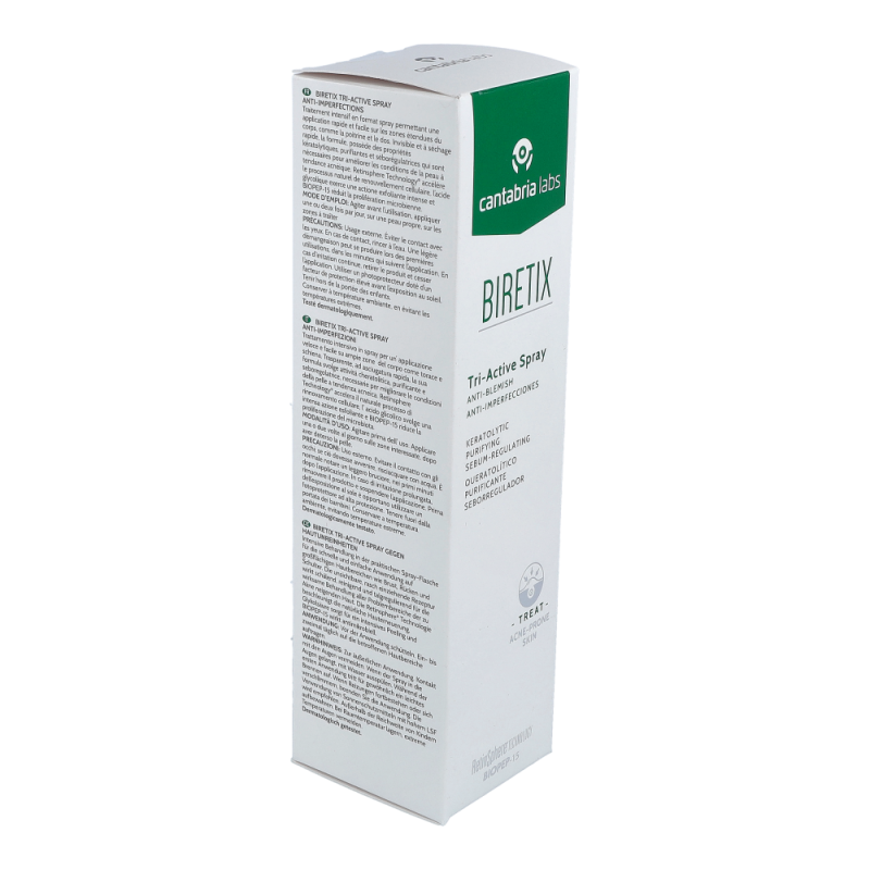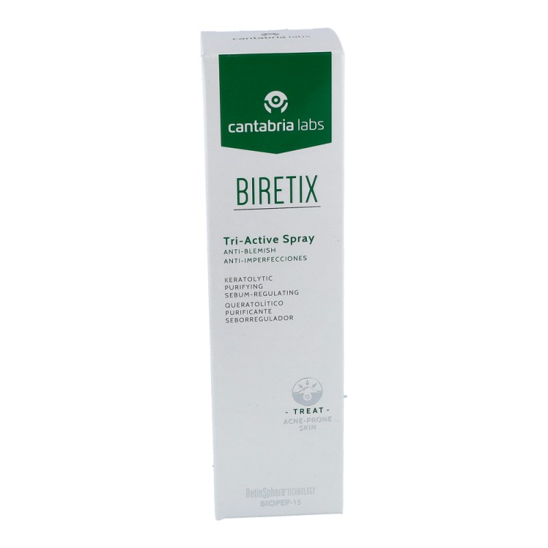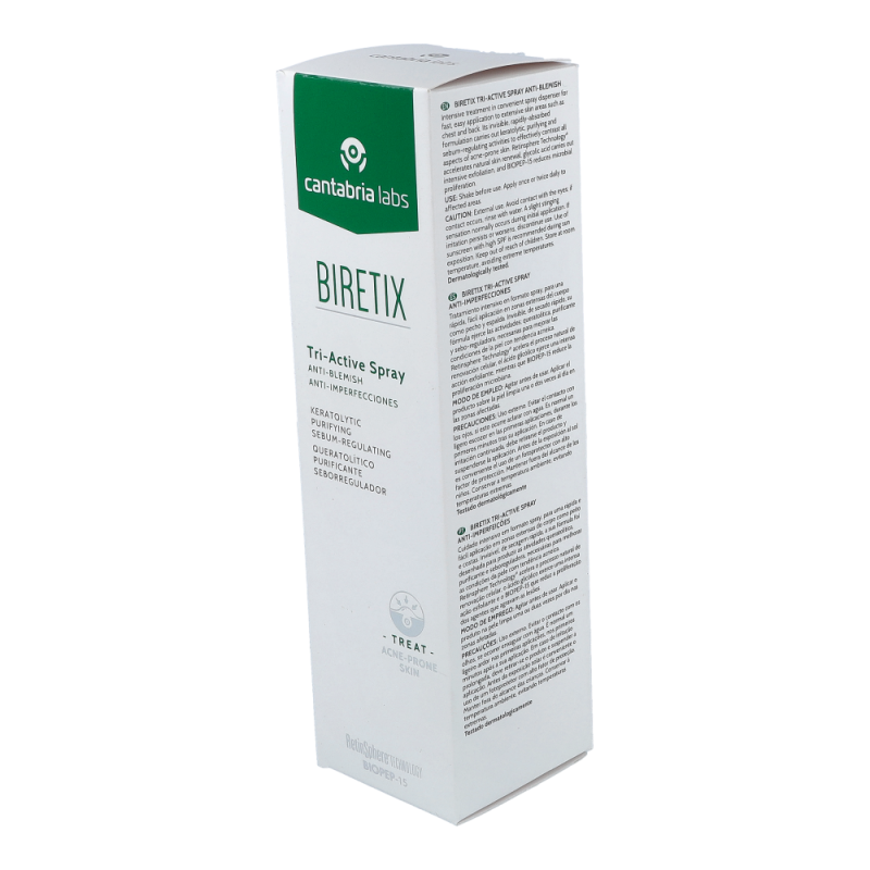 Biretix Tri-Active Spray 100ml regt durch die leicht schälenden Eigenschaften die Zellerneuerung an und beugt der Entstehung neuer Unreinheiten vor. Die innovative RetinSphere® Technologie schleust das Vitamin A sanft und ohne unerwünschte Wirkungen in die Haut ein. Vitamin A wirkt einer neuerlichen Verstopfung der Poren entgegen. Die Kombination mit dem gegen Aknekeime wirksamen Komplex BIOPEP-15 ist für die hervorragende Wirksamkeit und außergewöhnliche Verträglichkeit von BIRETIX Tri-Active Spray verantwortlich. Die enthaltene Glykolsäure schält sanft, Niacinamid wirkt Irritationen entgegen, Talg regulierend und reinigend. Diese kosmetische Aknebehandlung für den Körper wirkt antioxidativ und neutralisiert die durch Entzündungsreaktionen entstandenen freien Radikale.