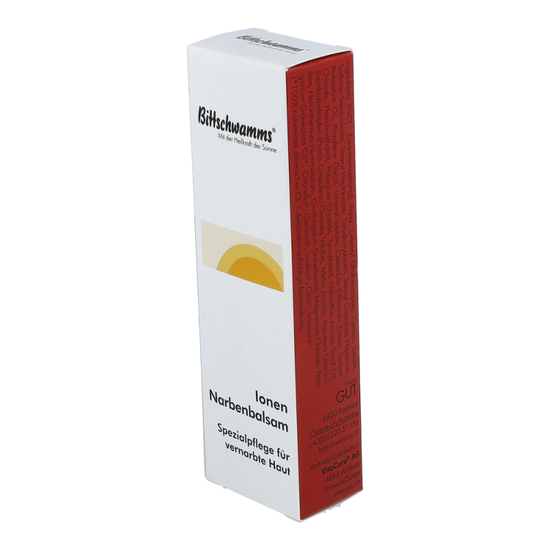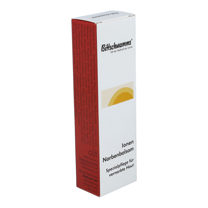 Bittschwamms Ionen Narben Balsam ist eine Kombination aus Ionen, Johanniskrautöl und einem Ringelblumenextrakt, welche zusammen mit dem ätherischen Öl der Rosengeranie den Wirkstoffkomplex dieses Ionen-Pflegebalsames bildet. Durch die Anwendung werden vernarbte Hautstellen weicher und fühlbar glatter sowie “entstörtö. ist dieses Produkt in den Packungsgrößen 20 g und 60 g erhältlich.