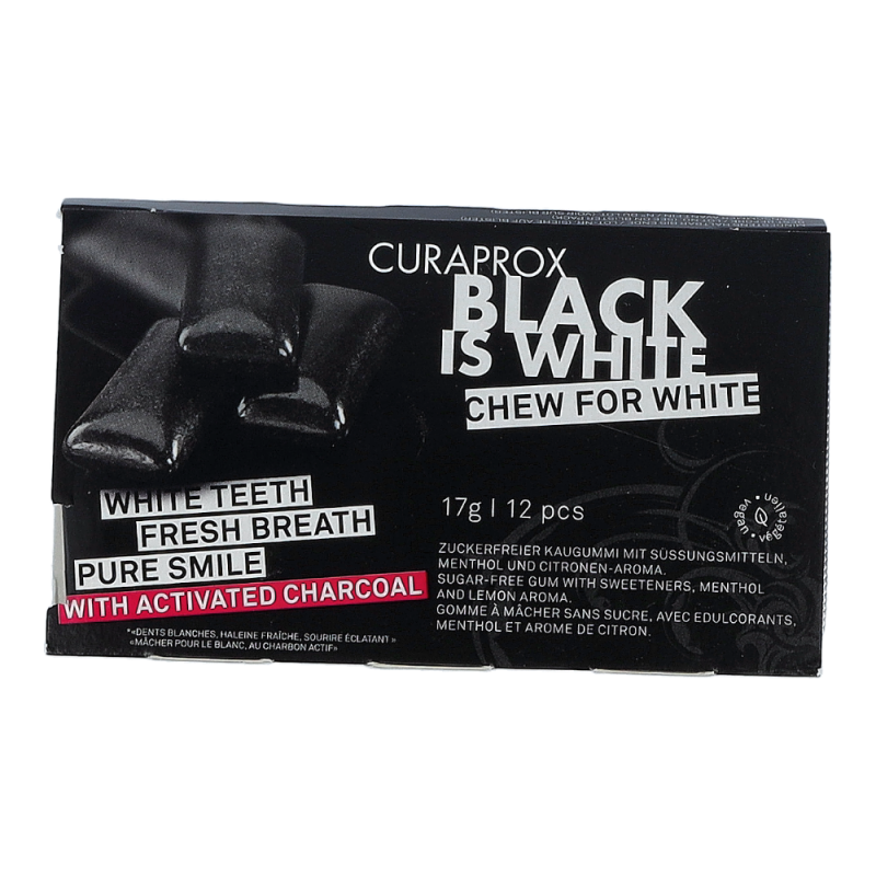 Black is White Kaugummi macht die Zähne dank Aktivkohle weiß. Weitere wertvolle Inhaltsstoffe schützen vor Karies und unterstützen die Mundhygiene. Der limonig-minzige Geschmack ist erfrischend, der Kaugummi zu 100% vegan und frei von Gentechnik.