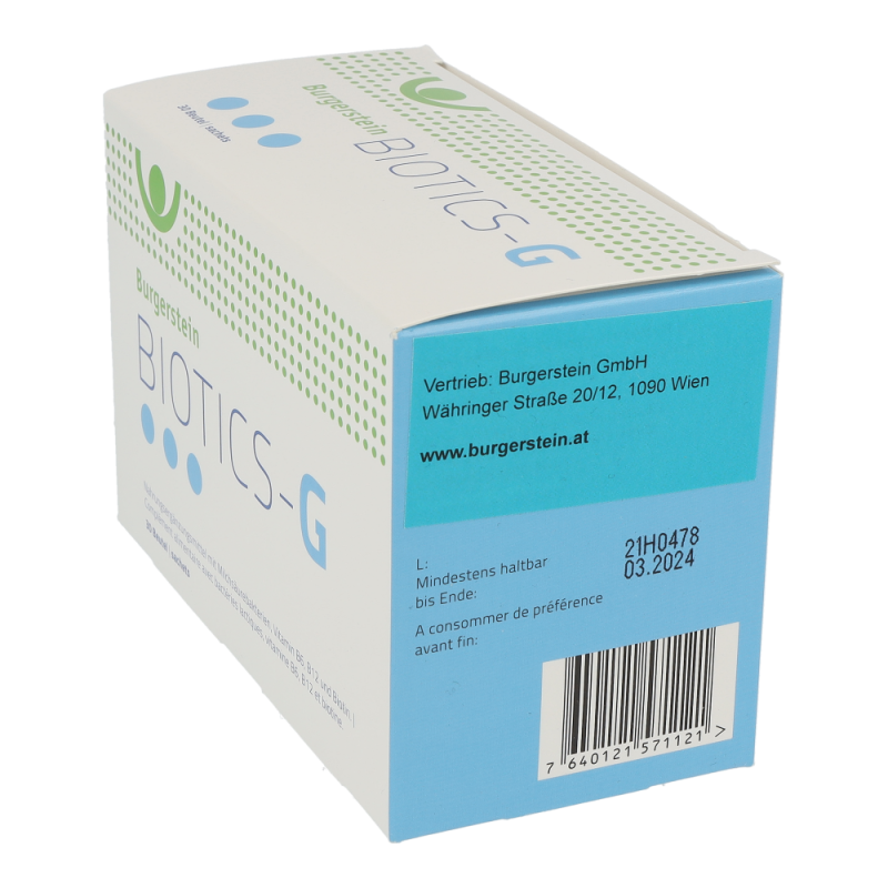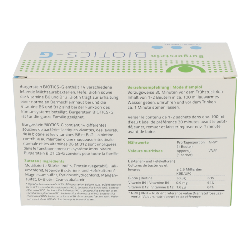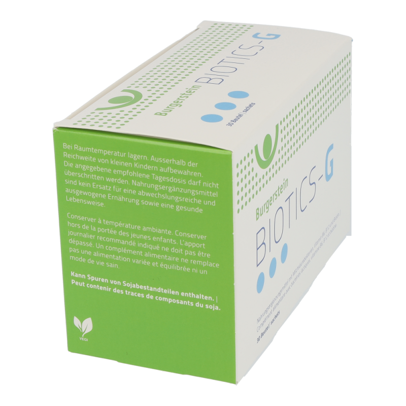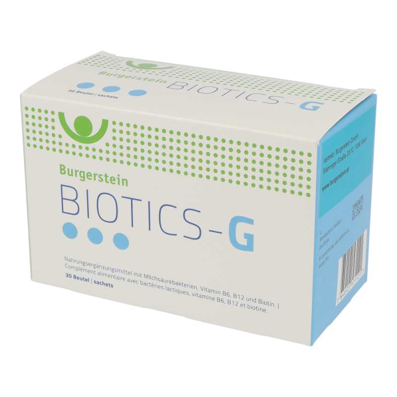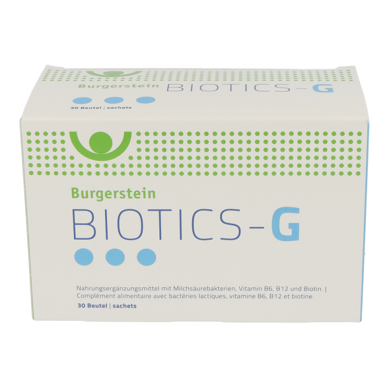 Burgerstein BIOTICS-G ist eine einzigartige Mischung aus 14 unterschiedlichen, lebendigen Milchsäure-produzierenden Bakterienkulturen und einem Hefestamm. Jede Tagesdosis (1 Beutel) enthält 2,5 Milliarden koloniebildende Einheiten. Die innovative Schutztechnologie Probioact® sorgt dafür, dass die nützlichen Bakterien länger haltbar sind und im Darm besonders aktiv bleiben. Burgerstein BIOTICS-G kann problemlos bei Raumtemperatur aufbewahrt werden. Zusätzlich sind Biotin, B6 und B12 enthalten. Das Produkt ist für Vegetarier geeignet (vegi/vegetarisch).