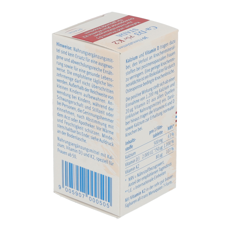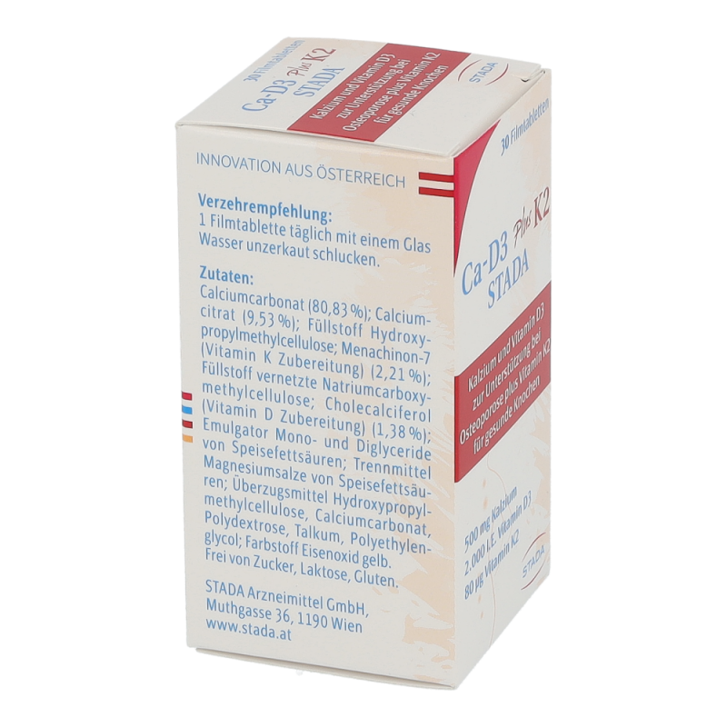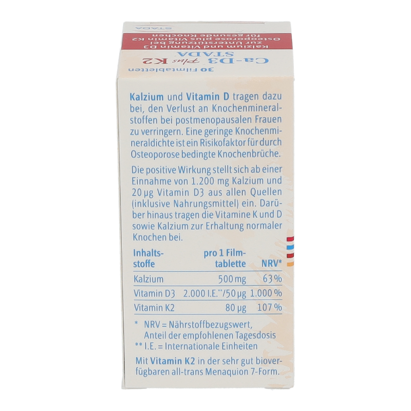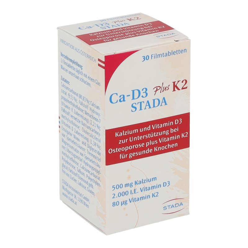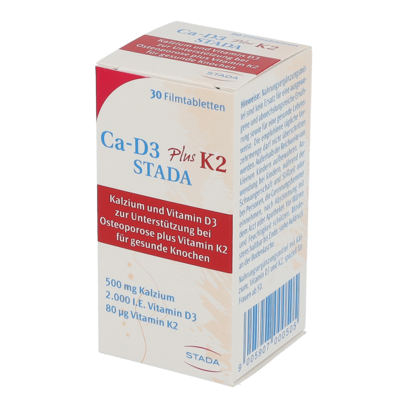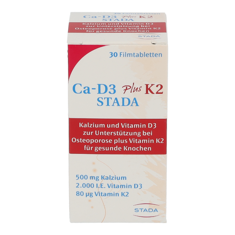 Ca-D3 plus K2 STADA ist ein Nahrungsergänzungsmittel mit Kalzium, Vitamin D3 und Vitamin K2 speziell für Frauen ab 50 Jahren. Es trägt dazu bei durch Osteoporose bedingten Knochenbrüchen vorzubeugen. Darüber hinaus tragen die Vitamine K und D sowie Kalzium zur Erhaltung normaler Knochen bei.