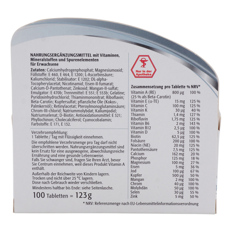 Centrum® Von A bis Zink Tabletten 100 Stk. enthalten sorgfältig aufeinander abgestimmte essentielle Vitamine, Mineralstoffe, Spurenelemente und Lutein. Diese Nährstoffe unterstützen den Funktionsablauf unseres Körpers und sind wie Kohlenhydrate, Fette und Eiweiße lebensnotwendig.
