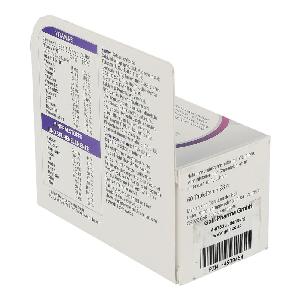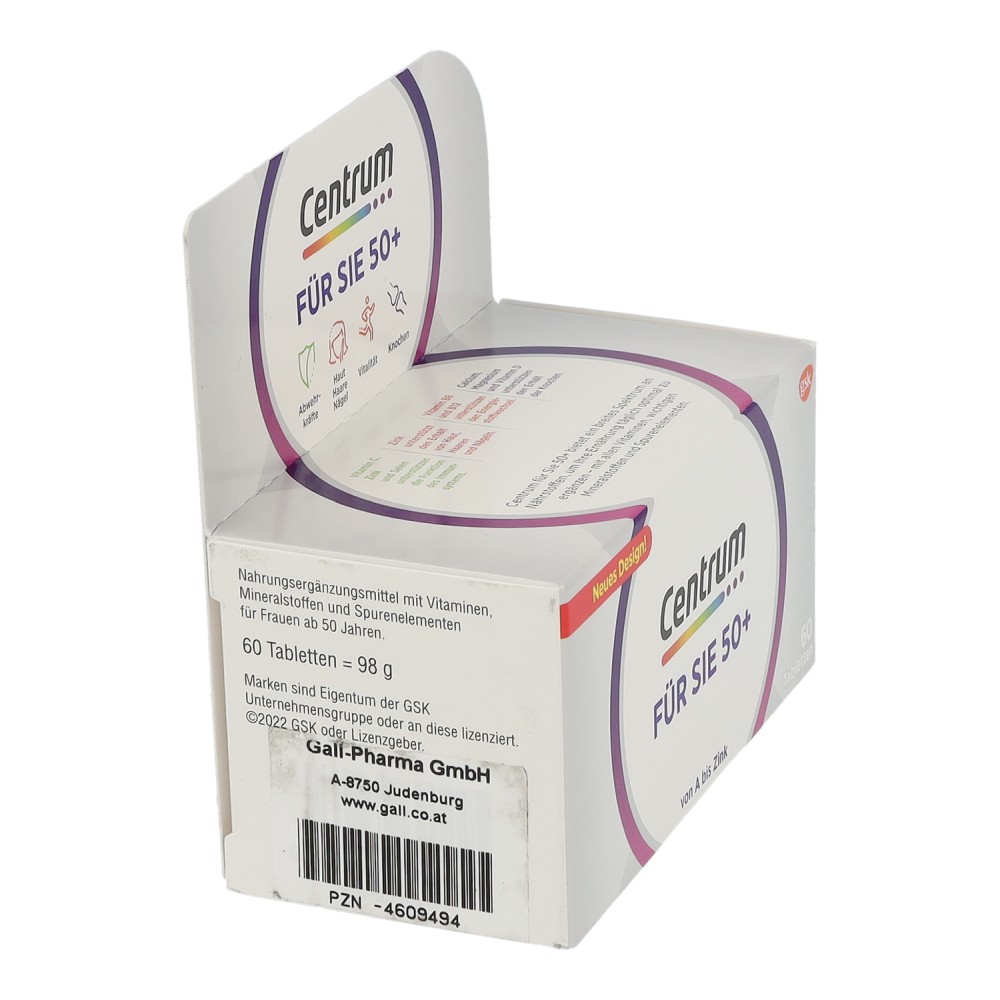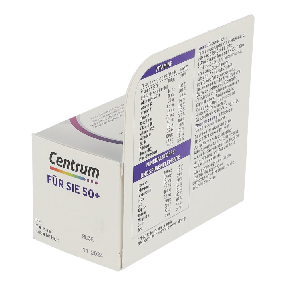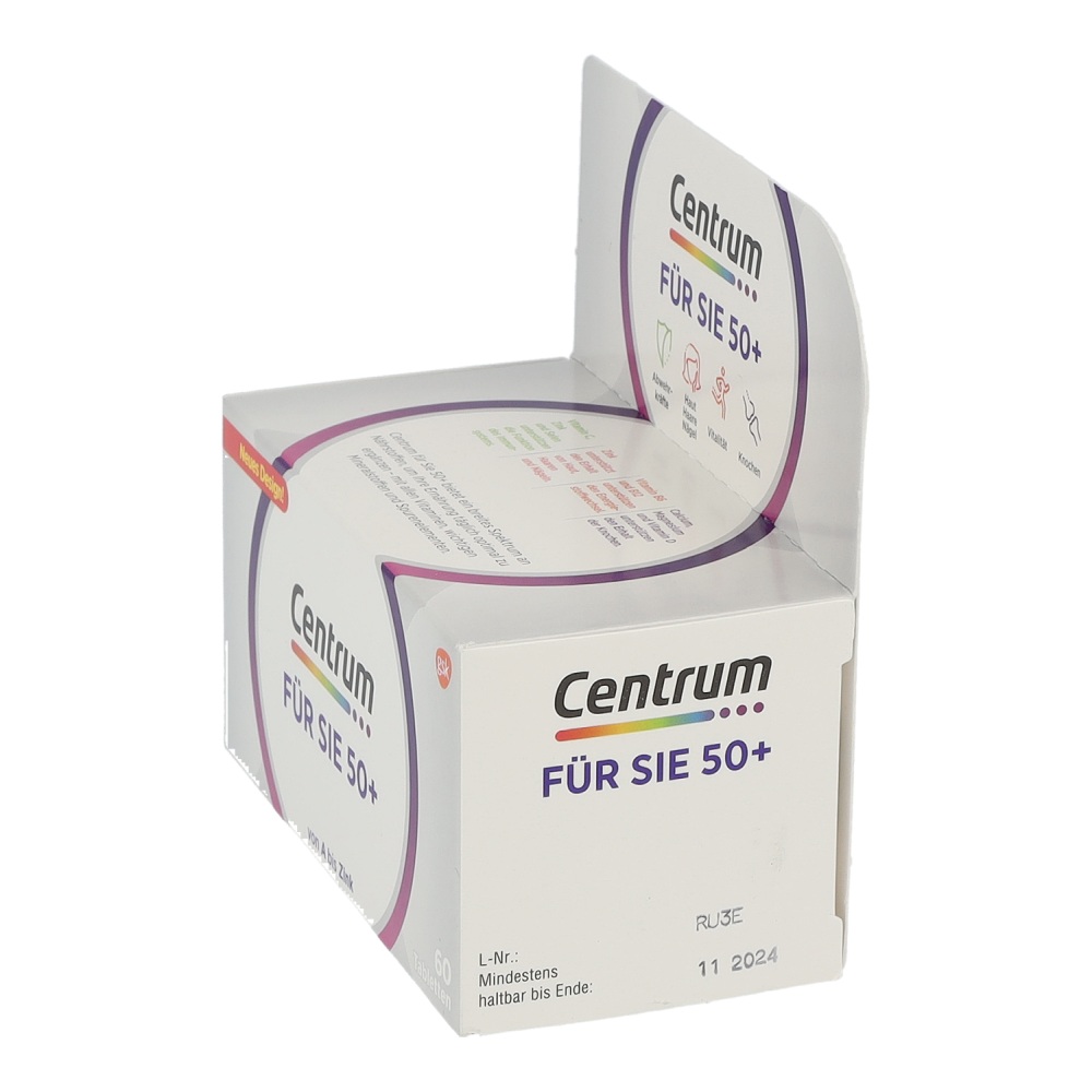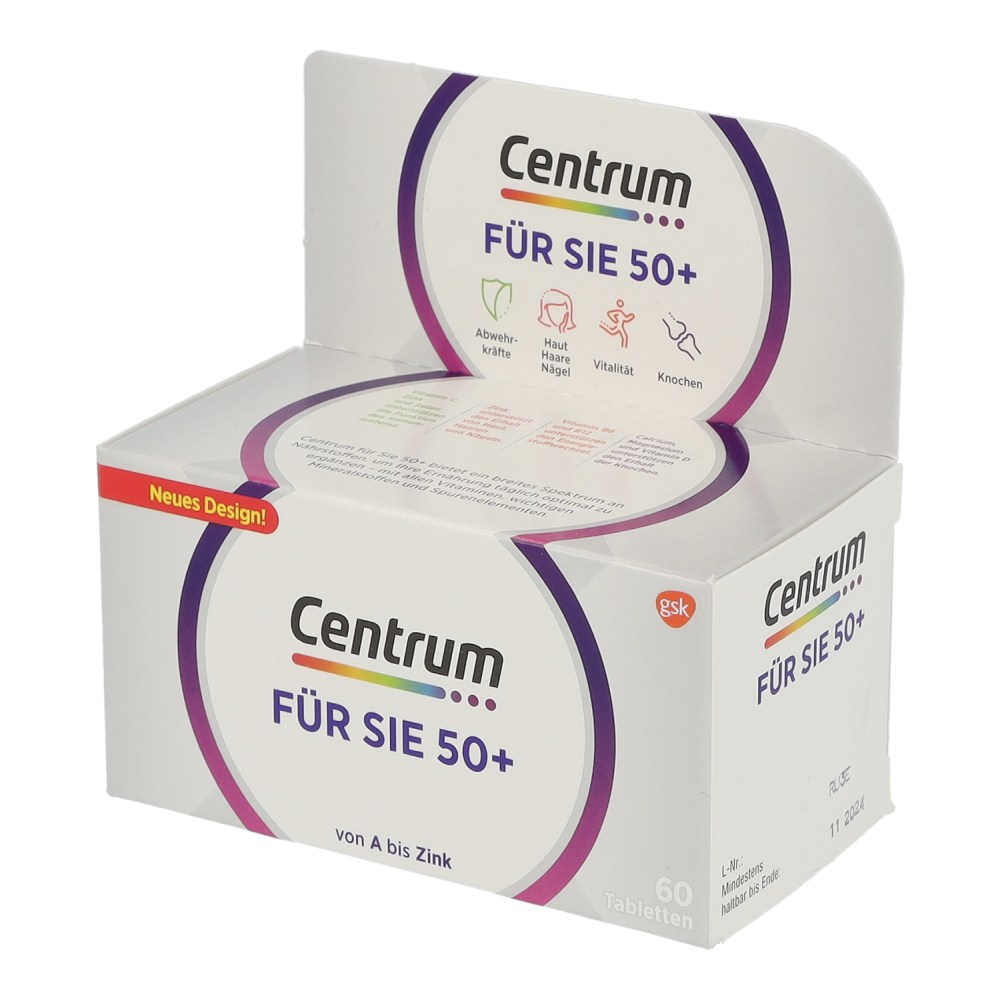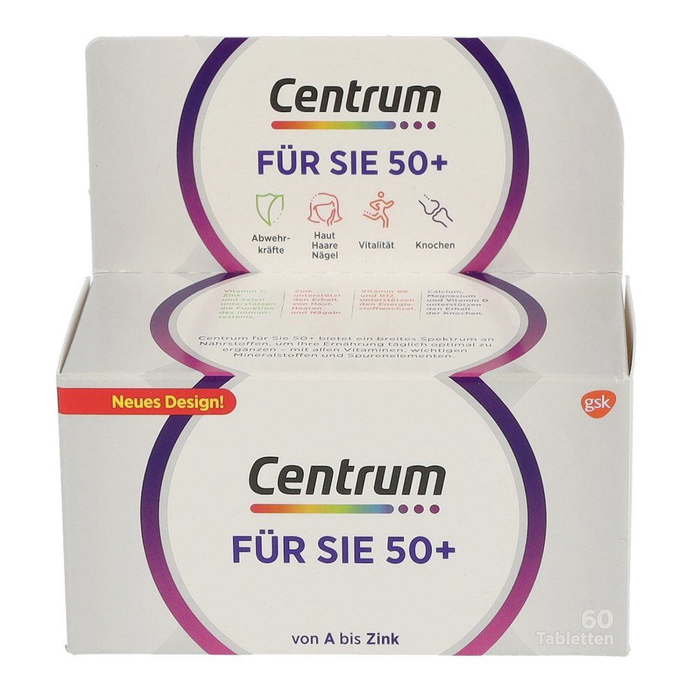Centrum Für Sie 50+ wurde an die Nährstoffbedürfnisse von Frauen über 50 angepasst. Es leistet einen wertvollen Beitrag an wichtigen Vitaminen, Mineralstoffen und Spurenelementen, um ihre Ernährung optimal zu ergänzen. Besonders die Nährstoffe Kalzium, Vitamin D und Eisen spielen eine große Rolle bei der Erhaltung der Körperfunktionen von Frauen. Centrum Für Sie 50+ mit der Frauen Gesundheitsformel: Kalzium und Vitamin D sind wichtig für den Erhalt der Knochen. Eine ausreichende Eisenzufuhr ist notwendig für die Bildung roter Blutkörperchen.