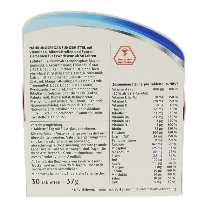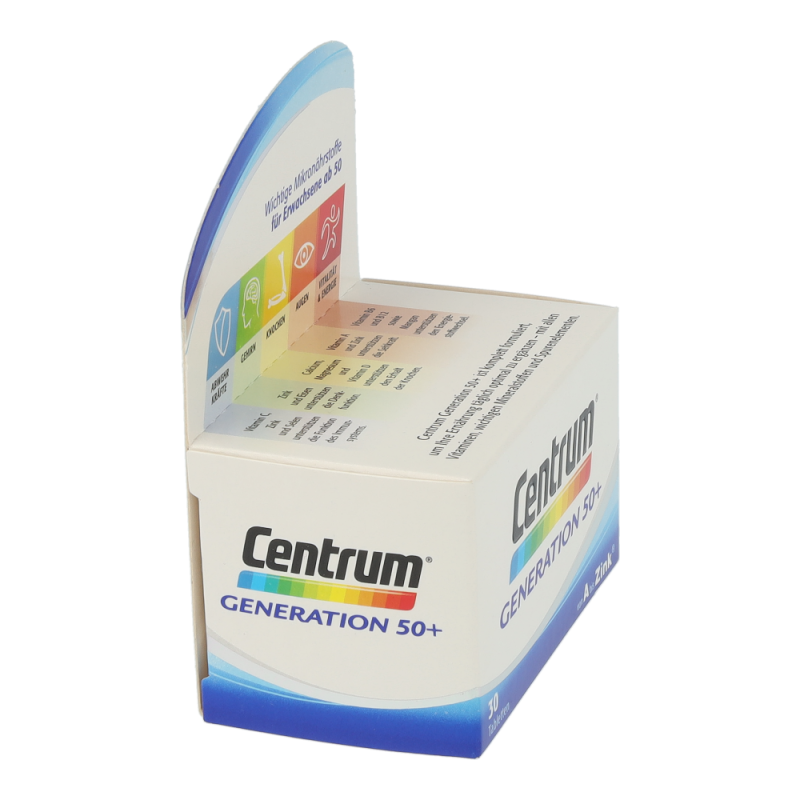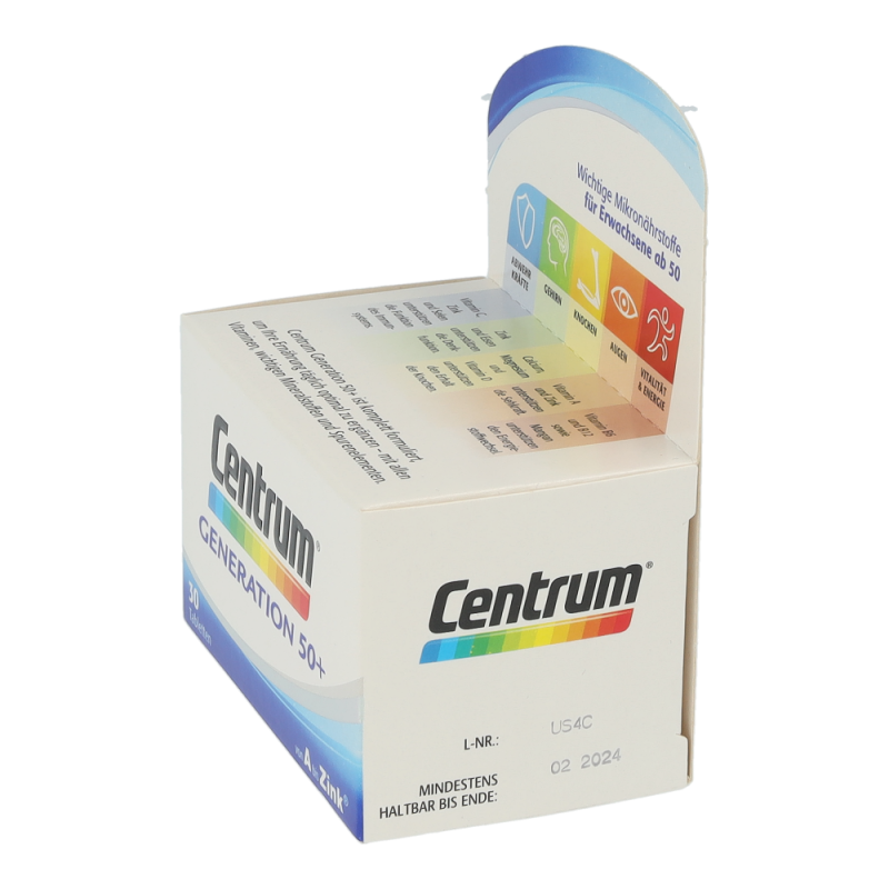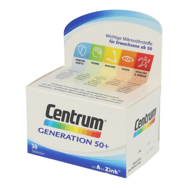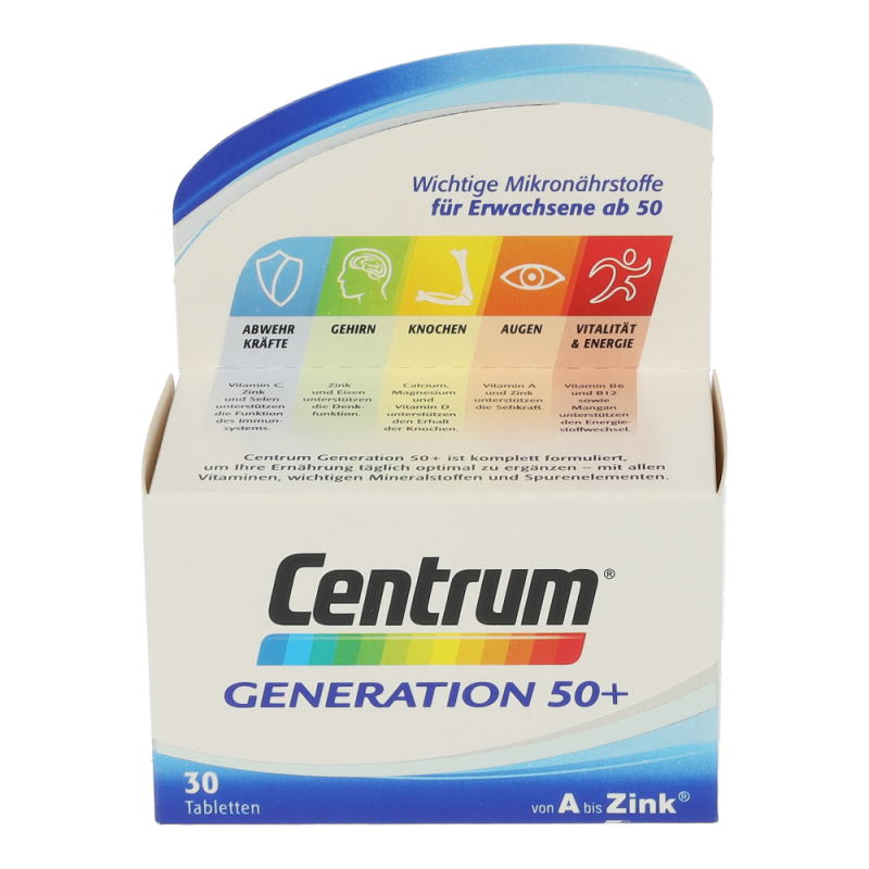 Der Energiebedarf im Alter sinkt, aber die erforderliche Menge an Mikronährstoffen sollte weiterhin gleichermaßen gewährleistet sein. Denn diese sind für den Erhalt des Wohlbefindens und der Leistungsfähigkeit besonders wichtig. Vitamin B12 beispielsweise trägt zu einem normalen Energiestoffwechsel und Vitamin C zu einer normalen Funktion des Immunsystems bei. Die Nährstoff-Formel Centrum „Generation 50+“ ist speziell an die Nährstoffbedürfnisse von Best Agern angepasst. Somit ergänzt Centrum „Generation 50+“ die Ernährung von Best Agern sinnvoll und bildet eine gesunde Basis für ihr Wohlbefinden.