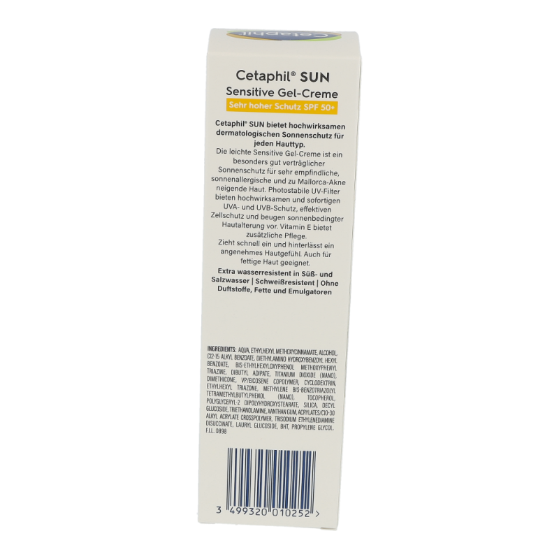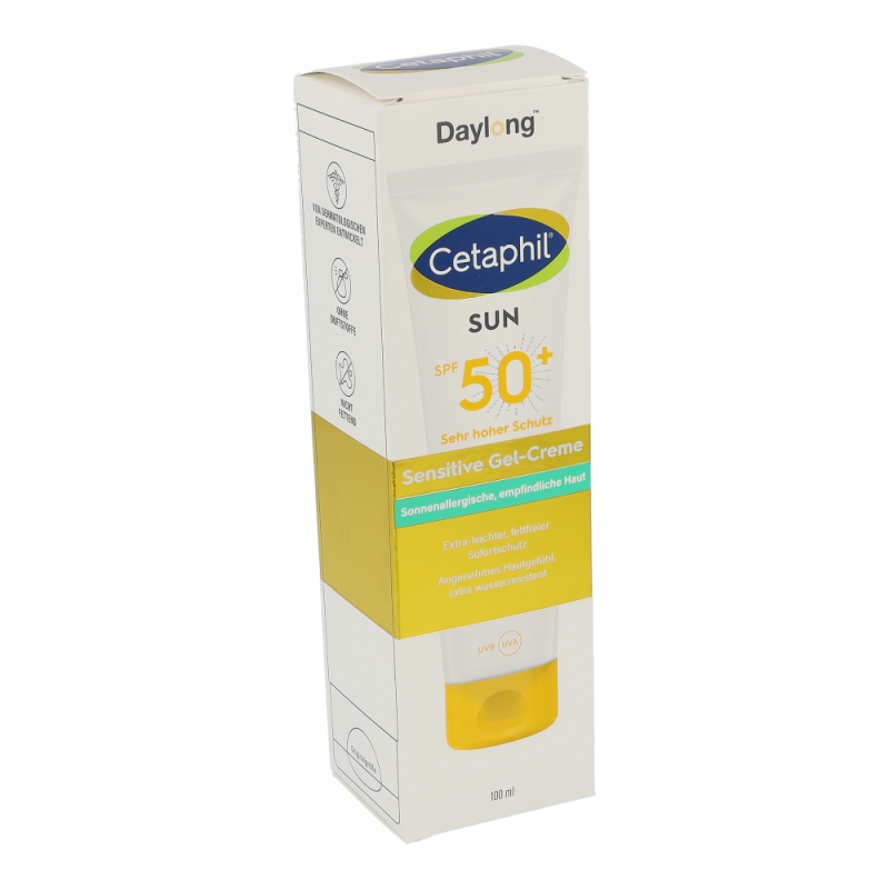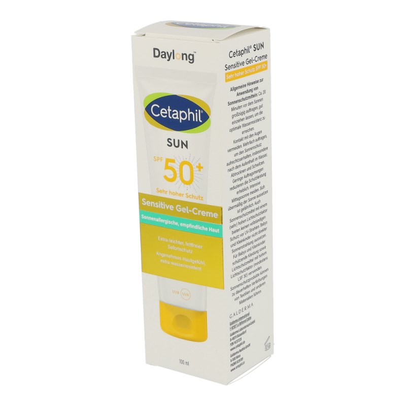 Die Cetaphil® Sun Daylong™ Sensitive Gel-Creme SPF 50+ zieht schnell ein und sorgt dank der fettfreien Formulierung für ein angenehmes Hautgefühl. Die Wirksamkeit und Hautverträglichkeit wurden in einer Studie bei Anwendern mit Sonnenallergien nachgewiesen. Photostabile UV-Filter bieten hochwirksamen und sofortigen UVA- und UVB-Schutz , effektiven Zellschutz1 und beugen sonnenbedingter Hautalterung vor1. Die Anwendung empfiehlt sich gerade auch bei sonnenüberempfindlicher und fettiger Haut. Cetaphil Sun Daylong Sensitive Gel SPF 50+ ist besonders geeignet für zu Sonnenallergie neigende sowie fettige Haut.