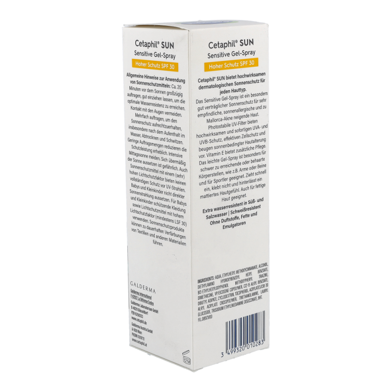 Cetaphil Sun Sensitive Gel-Spray SPF 30 ist besonders geeignet für zu Sonnenallergie neigende sowie fettige Haut. Es enthält weder Emulgatoren noch Fette, die in Kombination mit UVA-Strahlung die häufigsten Auslöser von Mallorca-Akne sind.