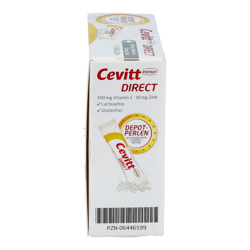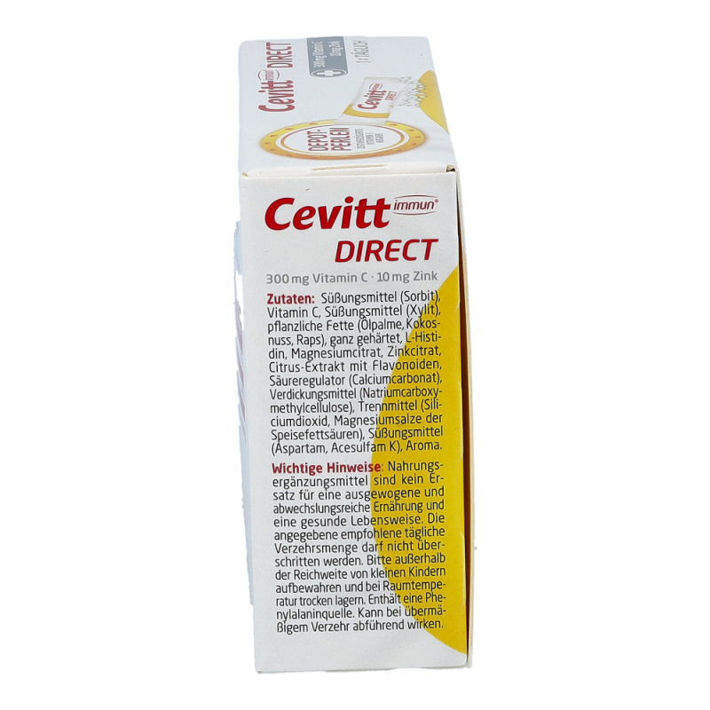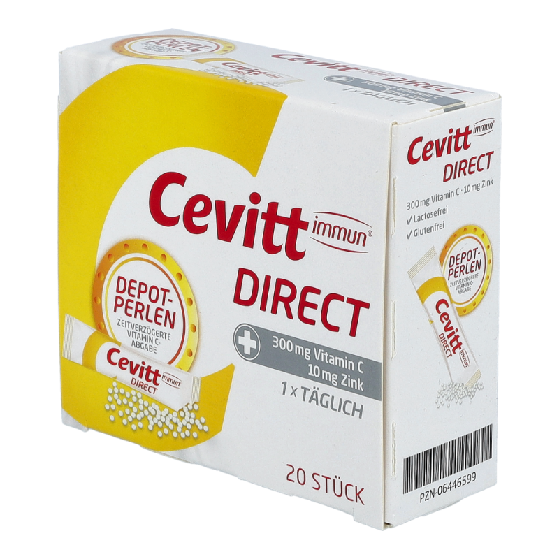 Cevitt immun® direct versorgt den Körper mit Vitamin C sowie Zink und bietet daher eine wertvolle Unterstützung für die Abwehrkräfte. Dank der praktischen Darreichungsform kann das Präparat zudem ohne Wasser eingenommen werden und eignet sich auch ideal für unterwegs. Da unser Immunsystem jeden Tag aufs Neue herausgefordert wird, ist eine normale Funktion unserer Abwehrkräfte besonders wichtig. Cevitt immun® direct bietet eine besonders einfache Möglichkeit, dem Körper wertvolle Nährstoffe zuzuführen. Die spezielle Formulierung mit Vitamin-C Depot-Perlen-Technologie stellt dem Körper 150 mg Vitamin C direkt zur Verfügung, während die anderen 150 mg überzogen sind und daher über mehrere Stunden abgegeben werden. Die Rezeptur wird ideal durch Zink (10 mg) und Citrus-Flavonoide ergänzt, die dank ihrer antioxidativen Wirkung das Vitamin C schützen und seine Aufnahme steigern. Histidin verbessert zusätzlich die Aufnahme von Zink. Die Pellets können direkt ohne Wasser eingenommen werden und eignen sich dank ihrer Stickverpackung ideal für unterwegs. .