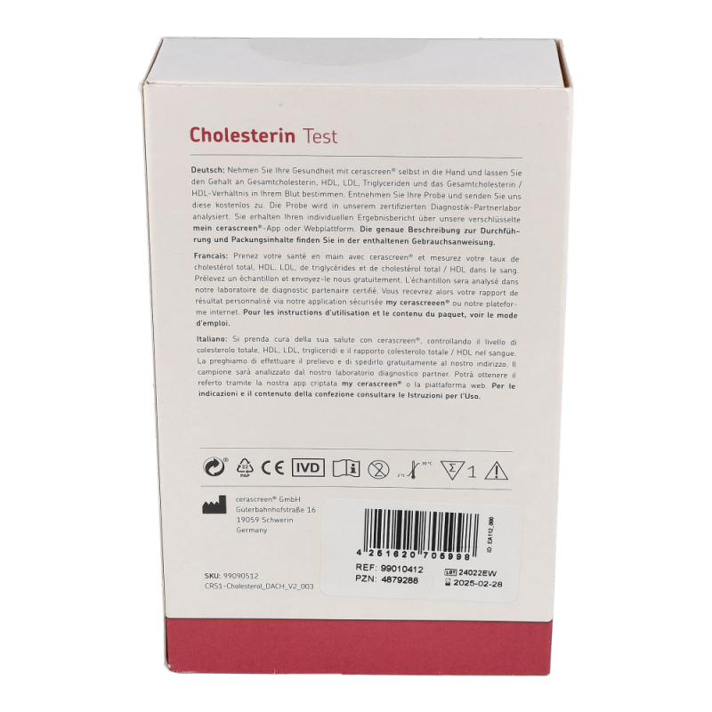 Der Cholesterin-Test von cerascreen ist ein Testkit zur Ermittlung des Cholesterin-, HDL- und LDL-Spiegels sowie des LDL/HDL-Quotienten. Der Test ist ein Selbsttest, der zu Hause durchgeführt werden kann. Das Testkit beinhaltet alles Notwendige für die Probenentnahme. Nach der kostenlosen Einsendung der Probe in das zertifizierte, diagnostische Fachlabor ist das Ergebnis nach wenigen Tagen abrufbar. Zusätzlich zum Ergebnis erhalten die Kunden hilfreiche Tipps und Handlungsempfehlungen