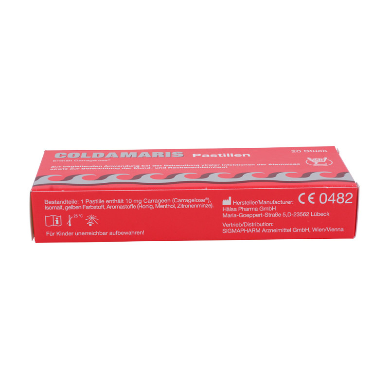 Coldamaris Pastillen werden verwendet zur Befeuchtung der Mund- und Rachenschleimhaut, z.B. bei trockener Atemluft, Husten oder Heiserkeit zur Vorbeugung und unterstützenden Behandlung aller Beschwerden, die infolge trockener oder gereizter Mund- und Rachenschleimhaut bestehen, wie z.B.: durch Rauchen, langes Sprechen oder Singen und zur begleitenden Anwendung bei der Behandlung viraler Infektionen der oberen Atemwege. Coldamaris Pastillen enthalten den aus Rotalgen gewonnenen Wirkstoff iota-Carrageen (Carragelose®).