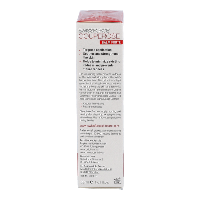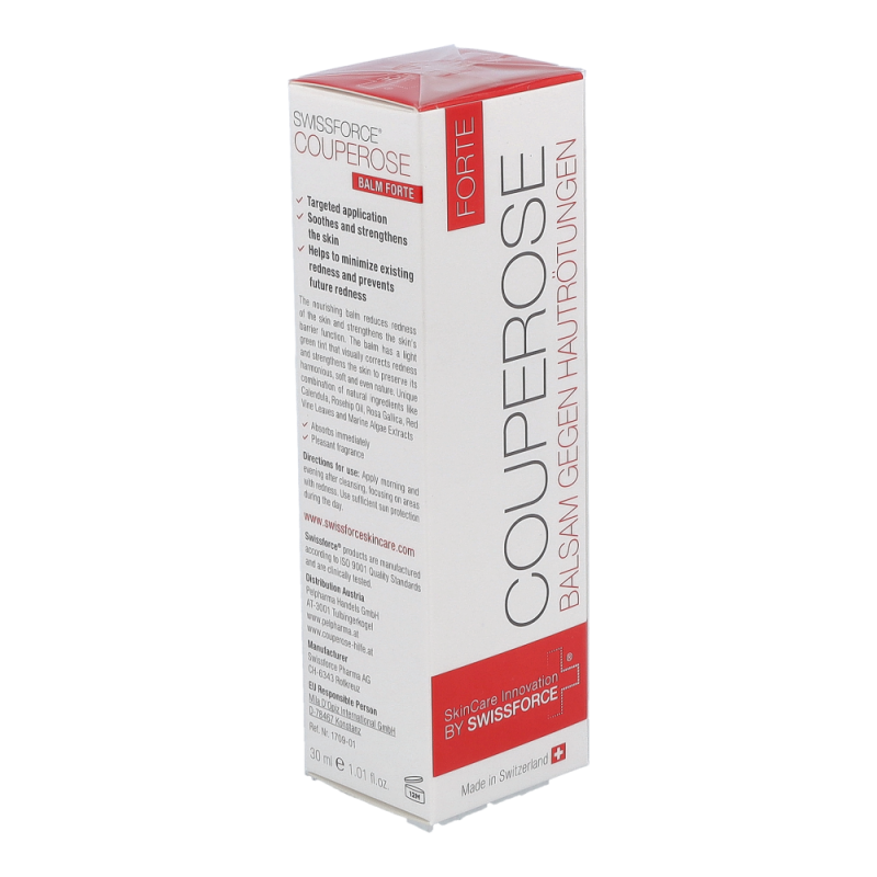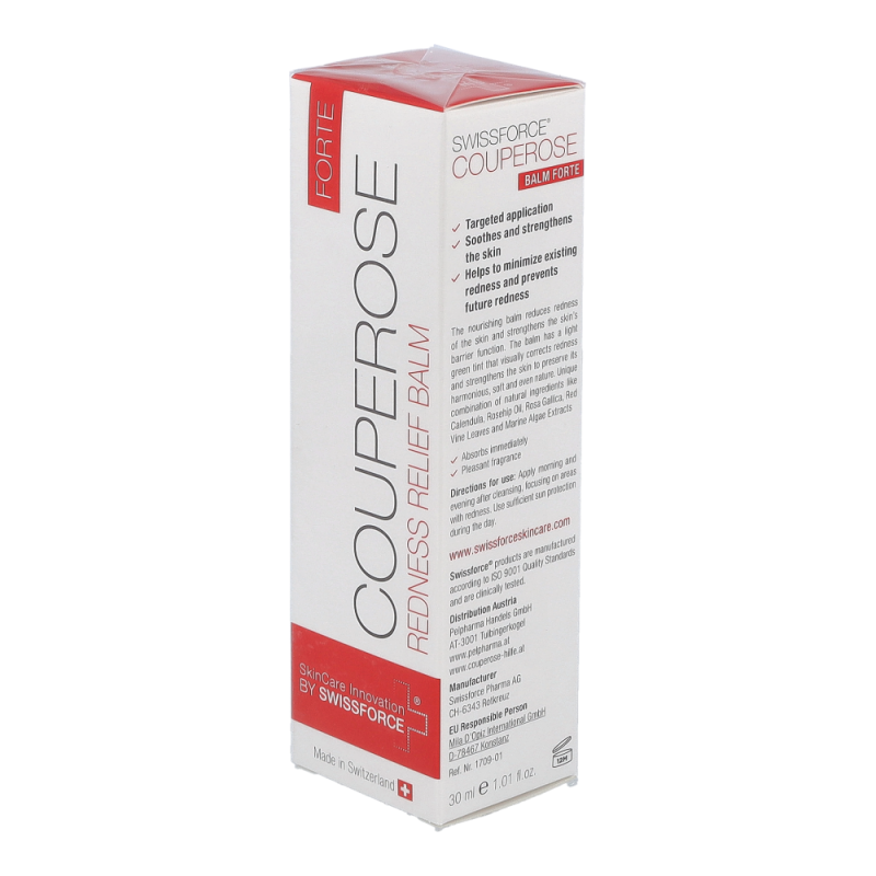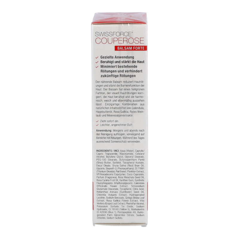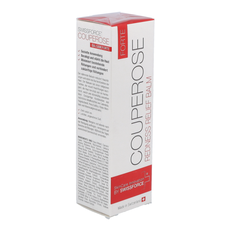 Couperose Rötungen & Äderchen Forte Balsam ist ein pflegender Balsam gegen Hautrötungen und Äderchen. Der nährende Balsam stärkt die Haut und Blutgefäße, reduziert das Erscheinungsbild von Couperose und Hautrötungen. Es hält den Feuchtigkeitshaushalt der Haut im Gleichgewicht. Die einzigartige Kombination von Wirkstoffen schützt und beruhigt die Haut und lässt sie harmonisch, weich und ebenmäßig aussehen.