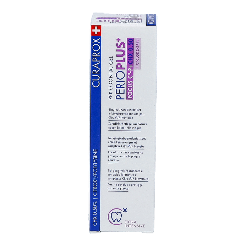 Curaprox Perio Plus+ Focus Zahngel mit Hyaluronsäure – lokal applizierbar, stark dosiert: Schützt und pflegt das Zahnfleisch, schützt gegen bakteriellen Plaque. Durch die Hyaluronsäure wird die Gewebeerneuerung unterstützt. Es kontrolliert bakterielles Wachstum durch 0,5% Chlorhexidin-Diglukonat und bewahrt die Zähne so vor Karies.