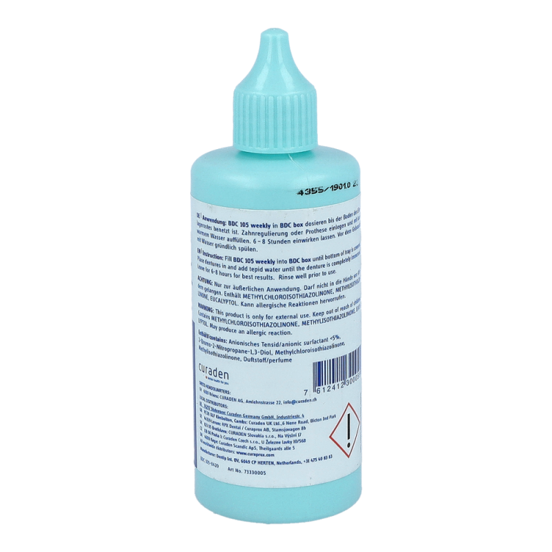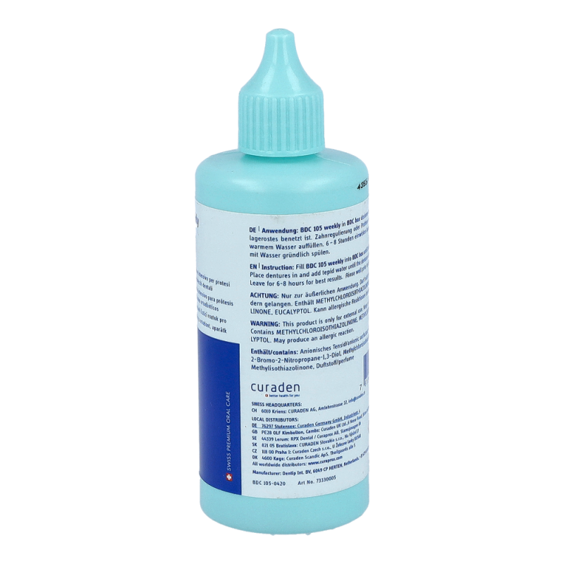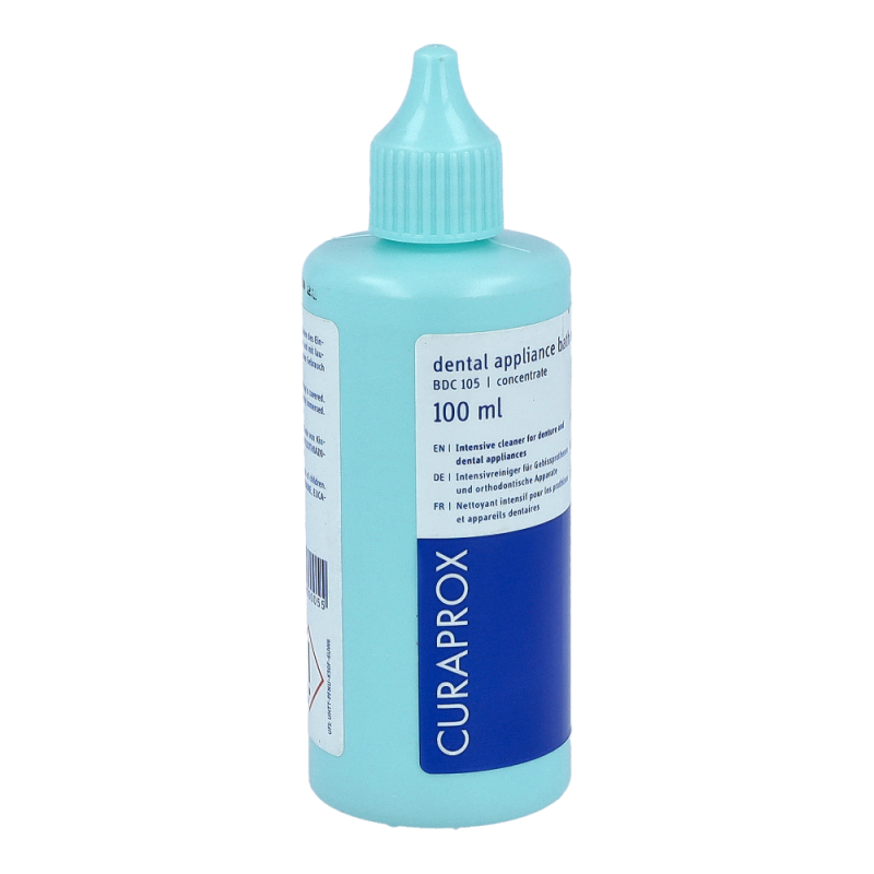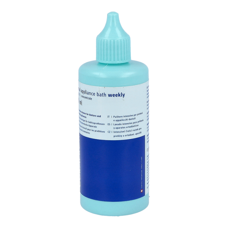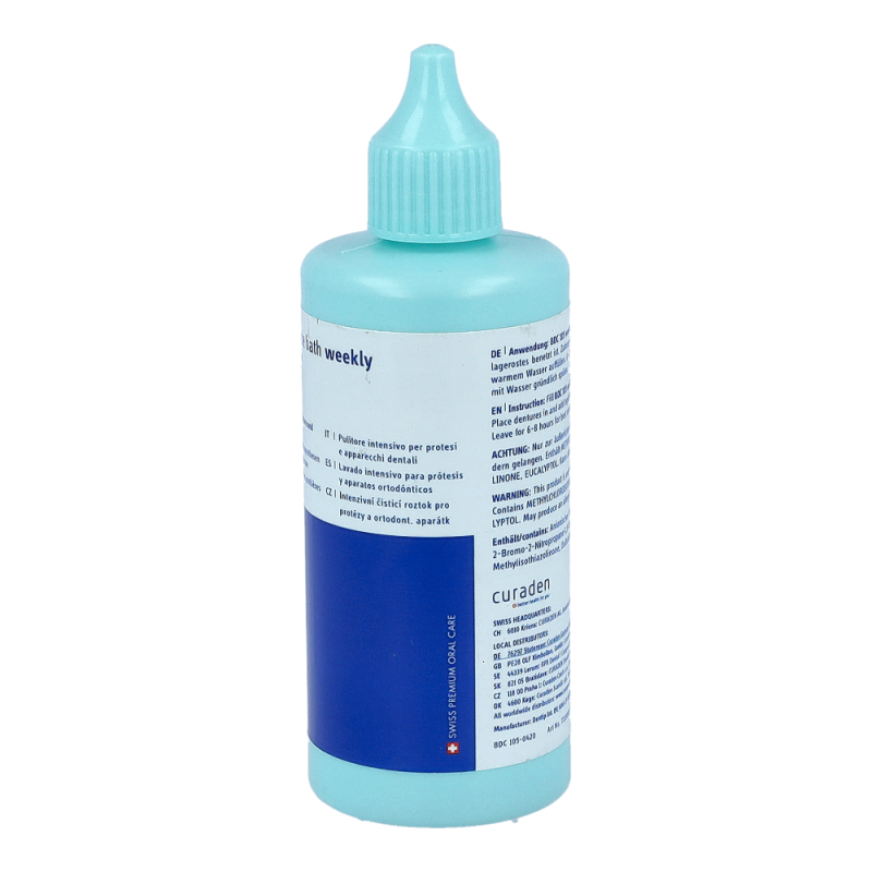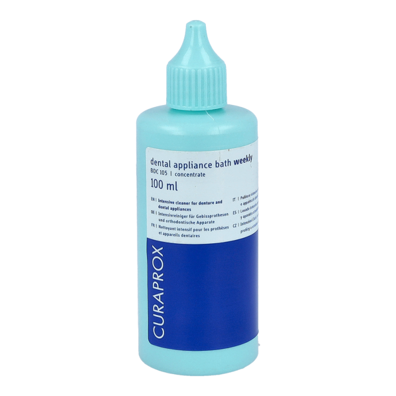 Curaprox Weekly Konzentrat ist ein Reinigungskonzentrat zum Verdünnen. Das Konzentrat pflegt natürlich und hält Prothesen lange wie neu. Außerdem reinigt und desinfiziert es schonend und sorgt so für eine lange Lebensdauer des Zahnersatzes.