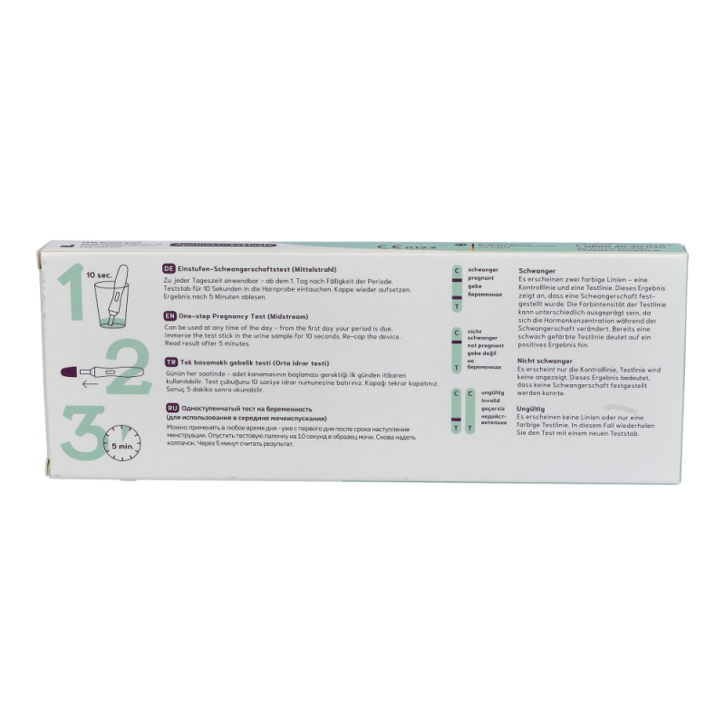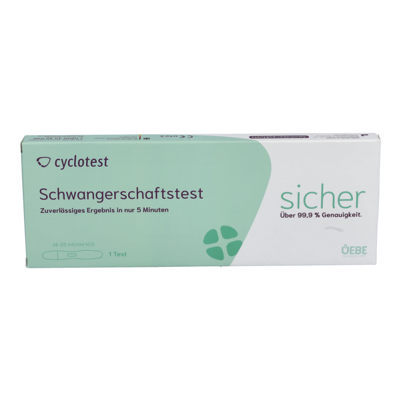 CYCLOTEST Schwangerschafts-Test, Ein-Stufen-Schwangerschaftstest, zu jeder Tageszeit und am ersten Tag nach Fälligkeit der Periode anwendbar; Anzeige bereits ab 25 IU/L hCG-Konzentration im Harn.